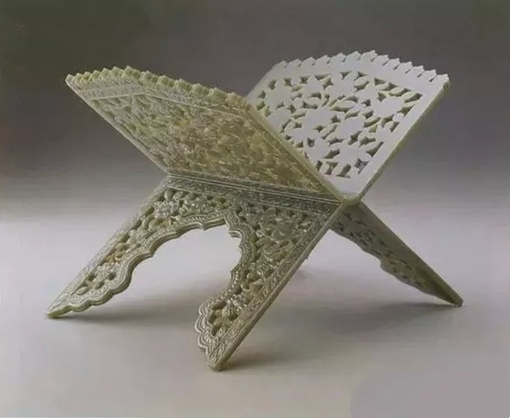 长35.6公分 宽21.2公分、全器镂雕花叶纹,外侧器表并浅浮雕出花心、叶脉等细节,经架上缘装饰一列冠式花边,典型的伊斯兰风格。此器开启状如英文字母「X」,回教清真寺内常以此置放可兰经。