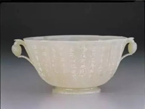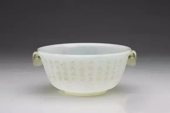 全高7.8公分 口径16.7公分 底径8.05公分、玉质,色白润略带灰。侈口微撇,深弧壁,圈足,双耳雕作下垂蓓蕾。口沿与器腹下方各琢莨苕叶纹一周,器底琢复瓣多层朵花。器身琢乾隆御制诗,咏赞印度玉佳工良,款属「乾隆辛丑御题」,并有「会心不远」、「德充符」二印