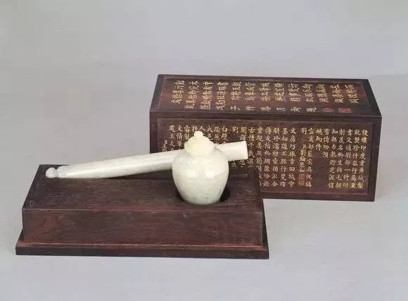 玉质青中泛灰,然光泽清亮。器形甚为特殊,乃一有盖之圆瓶连一长直玉管。盖、肩及管的一端均琢出浮凸的花瓣纹,洋溢伊斯兰的风味。玉瓶腹部镌有清高宗三十三年(1768)御制诗一首,此诗亦刻在清宫所配之木盒的盖顶上。此外,盒盖的四壁尚镌有刘统勋、刘纶、于敏中、王际华、曹文埴、彭元瑞、沈初、董诰等词臣的咏赞之文。高宗御制诗诗题为〈咏痕都斯坦玉墨瓶笔室〉,而诗序则以「制出回中珍储席上」起首,均明确的指出此件玉器系西域所制的文房用品。此外,诗注内还特别提及「中土聚毫为笔;外域削木供书」,除了是解释玉管的孔径窄小却仍能置笔的原因之外,也是再次强调「其来万里而遥」的特殊性。乾隆皇帝时有召唤大臣共赏宫廷收藏,并一同为之赋诗吟咏的情形。就玉器类稍做整理而约略可知,体积庞大具有堂皇气派者,常是君臣文会的要角,例如,高宗便曾在重华宫中,为三十四年(1769)完成的大型「九龙玉瓮」茶宴廷臣及翰林。还有一些足以宣扬国威的朝贡之器,亦是乾隆皇帝好与词臣同赏的,如「痕都斯坦」玉器。「痕都斯坦」即Hindustan之译音,乃一地名,其地处现在的印度北部,曾隶属蒙兀儿帝国的势力范围。当地所制玉器华丽细腻、风格独具,艺术史名之为「蒙兀儿玉器」。同时,土耳其半岛的鄂图曼帝国亦有玉器工艺,风格近似,然精美不逮。十八世纪盛清之际,二者皆经过新疆东传至清廷,高宗统称为痕都斯坦玉器。蒙兀儿及鄂图曼帝国王室均信仰回教,痕都斯坦玉器遂洋溢伊斯兰风。此类玉器擅以纯净之玉色搭配繁复层叠的花叶纹,光洁丰美;有时器表镶嵌金丝及各色宝石,灿烂华丽;部份作品并追求薄可透纹的效果,精巧细致,清高宗甚为喜好,常咏赞其「制绝精巧」。