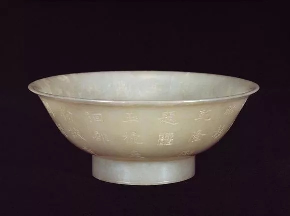 高5.6公分 口径13.5公分 足径6.2公分 口缘下三分之一处壁厚0.3公分、青灰色玉。圆碗,侈口,口缘略向外卷,高圈足。口缘及器腹下方各有弦纹一周。外壁加琢乾隆二十一年(1756)御制诗四十字、「乾隆御题」四字及「德充符」玺文一方。经核查该诗收录於《清高宗诗文全集》御制诗二集,卷65页18。原文中还附有诗注五十二字。兹抄录於下:回部叶尔奇木哈什哈尔初役属於准噶尔,为所拘絷,因我大军戡定伊犁始释之,令归所部。其长伯克和卓,遣使求内属,此其所贡也。由诗注及其它清史资料可知,当时南疆叶尔奇木(叶尔羌,即今之叶城)、哈什哈尔(喀什喀尔,即今之喀什)的回部领袖大小和卓木兄弟,正被准部拘絷於北疆的伊犁,乾隆二十年(1755)清军讨伐伊犁成功,释放二人,并令大和卓木回到南疆。次年大和卓木遣使求内属,并呈贡这件玉碗,据考证此玉碗可能与回族贵族女子香妃同时入宫。这件厚实、素朴,且抛光并不细润的玉碗,造形与游牧民族用以喝奶茶的「奶子碗」十分相近,应是十八世纪回部贵族使用的玉制容器