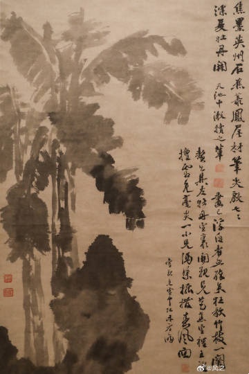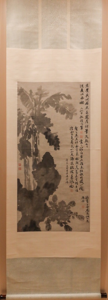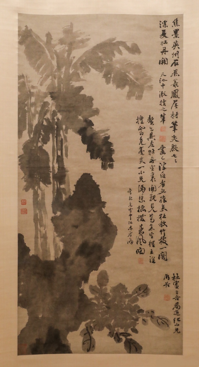 图绘湖石,石后芭蕉挺立,阔大的蕉叶错落有致,石畔牡丹横斜。全图笔酣墨饱,意趣横生。除了牡丹的叶脉之外,全用水墨泼写而成,墨色呈现干湿浓淡的变化,笔致恣肆,自成一格。