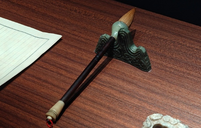 图6 山形玉笔架(明)及紫檀管螭纹玉斗兼毫提笔(清)