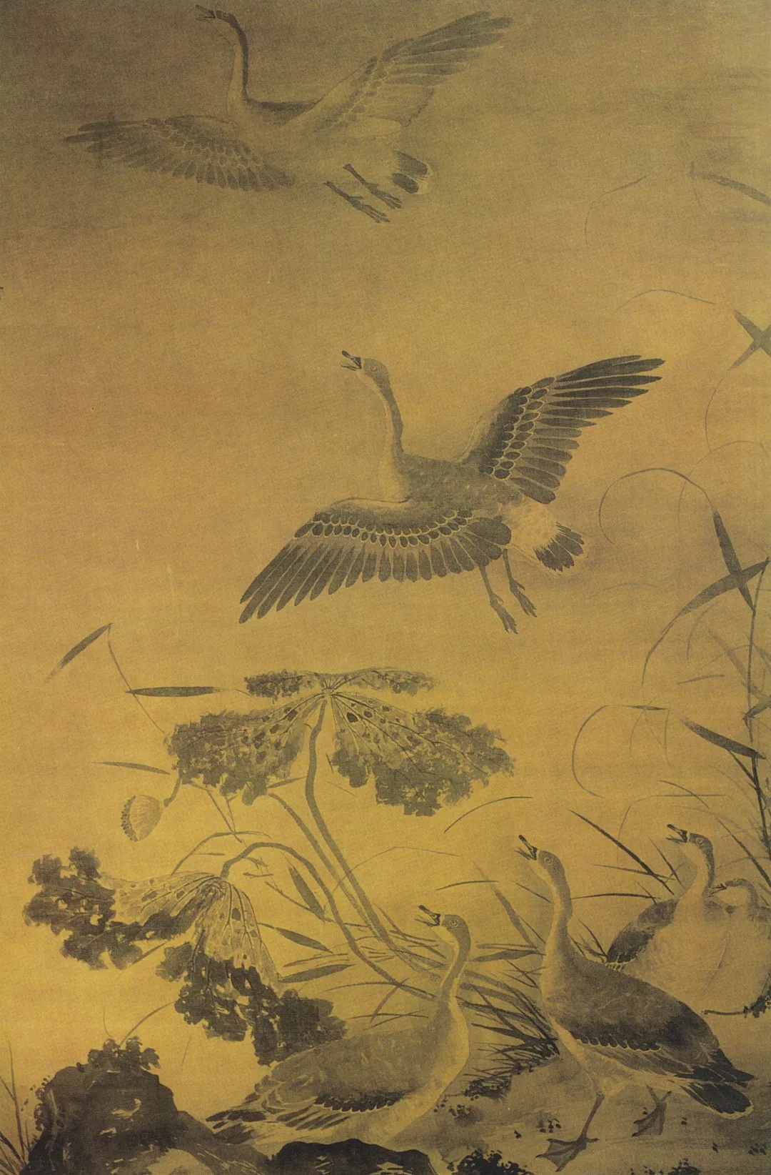 五代两宋时期,“芦雁图”臻于成熟,名家辈出,佳作叠呈。画史记载,黄筌、徐熙、黄居寀、邱庆余、董源、张泾、艾宣、惠崇、林生、陈偕、陈直躬、高焘、刘永年、晁说之、牧溪、赵佶、崔白、崔悫均创作过鸿雁题材的花鸟画作品,“黄家富贵”“徐熙野逸”,可谓是风格各异、精彩纷呈。譬如,黄筌绘有《霜林鸡雁图》,徐熙绘有《宿雁图》和《雪雁图》,邱庆余绘有《秋芦雁鹅图》,还有传为黄居寀绘制的《芦雁图》,均充分体现了五代及北宋初年主导皇家画院的黄筌富丽风格。