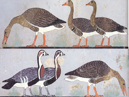 鸿雁是鸭科目大型水禽,广泛分布于世界各地。早在人类文明诞生的初期,世界许多地区的艺术家就将鸿雁作为绘画的表现对象。譬如,埃及古王国时期的墓室壁画《群雁图》,造型生动,色泽艳丽。在中国,无论新石器时代的彩陶,还是夏商周时期的青铜器,均有鸿雁或类似鸿雁的形象。而在汉代传世的绘画作品中,鸿雁形象已经被表现得极为生动了,尤其画像砖以其古拙厚重、质朴粗放的风格特点,赋予了鸿雁形象独特的艺术魅力。譬如,四川大邑出土的画像砖《戈射收获图》的“戈射”部分,荷塘边用力引弓的射手和天空中四散飞逃的鸿雁形成了强烈的对比。