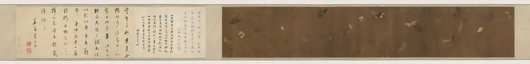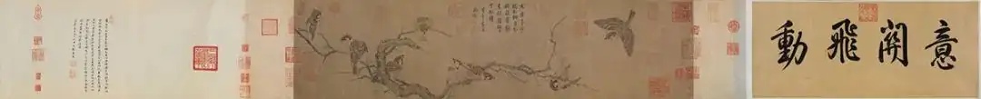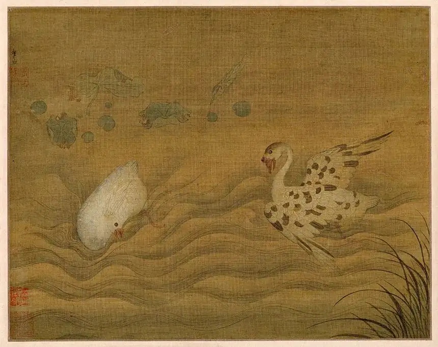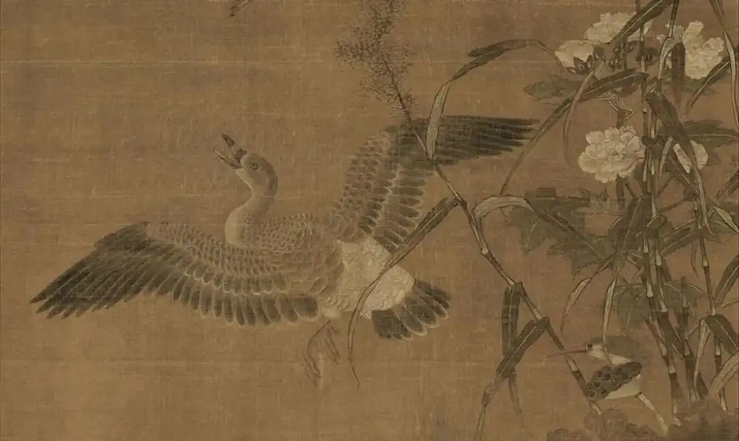 《秋浦蓉宾图》描绘了荷叶枯黄,芙蓉展艳的景象,画中展现出一派秋光旖旎的景象。花间鹤鸰腾跃,翡翠静静停留之中,两只鸿雁振翅高飞,整幅画意在千里。