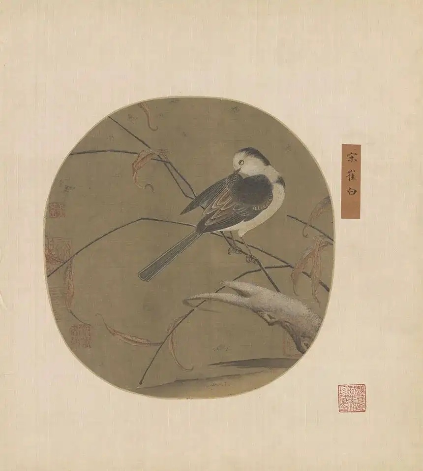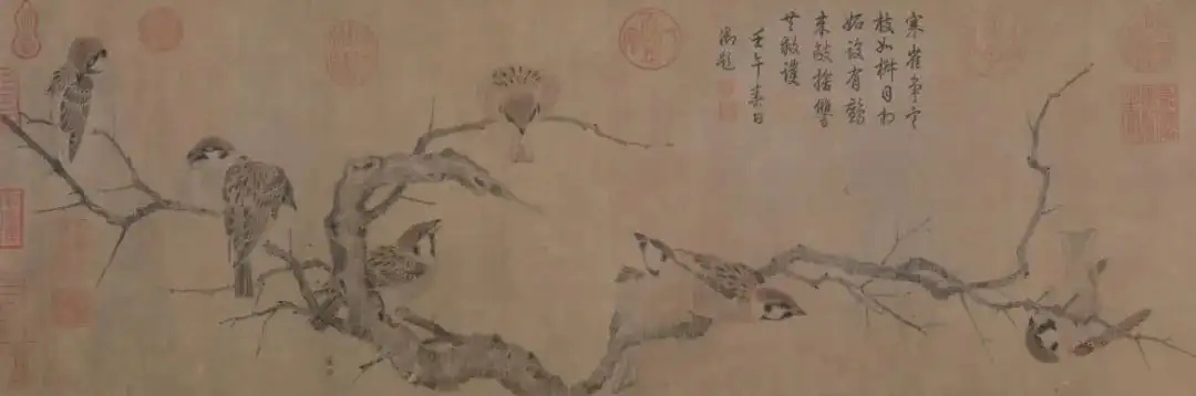 《寒雀图》描绘了枯木及九只麻雀飞动或栖止其间的情景,把禽鸟“地偏无人之态”的天然情趣,描绘得活灵活现。