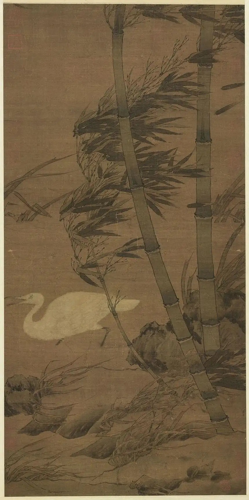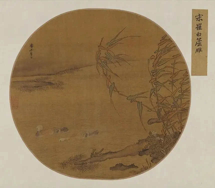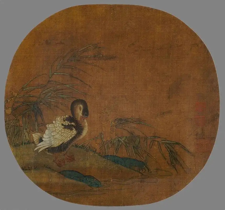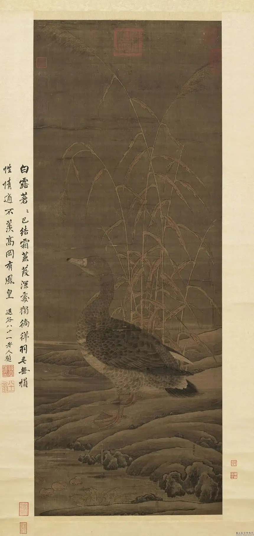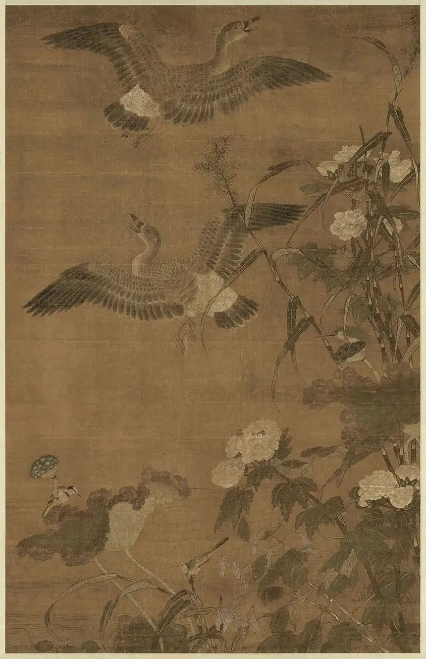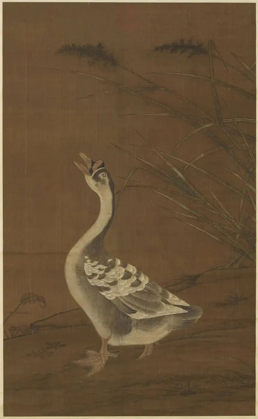 《芦雁图》水滨芦丛下,有只孤雁徘徊停留着。雁先以浓淡墨双钩成轮廓,然后用水墨渍染,再填以赭色和花青,表现出毛羽丰润的光泽。绢地染上淡墨,使背景趋于明显,并有寒气笼罩的感觉。
