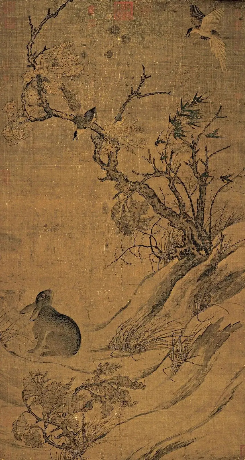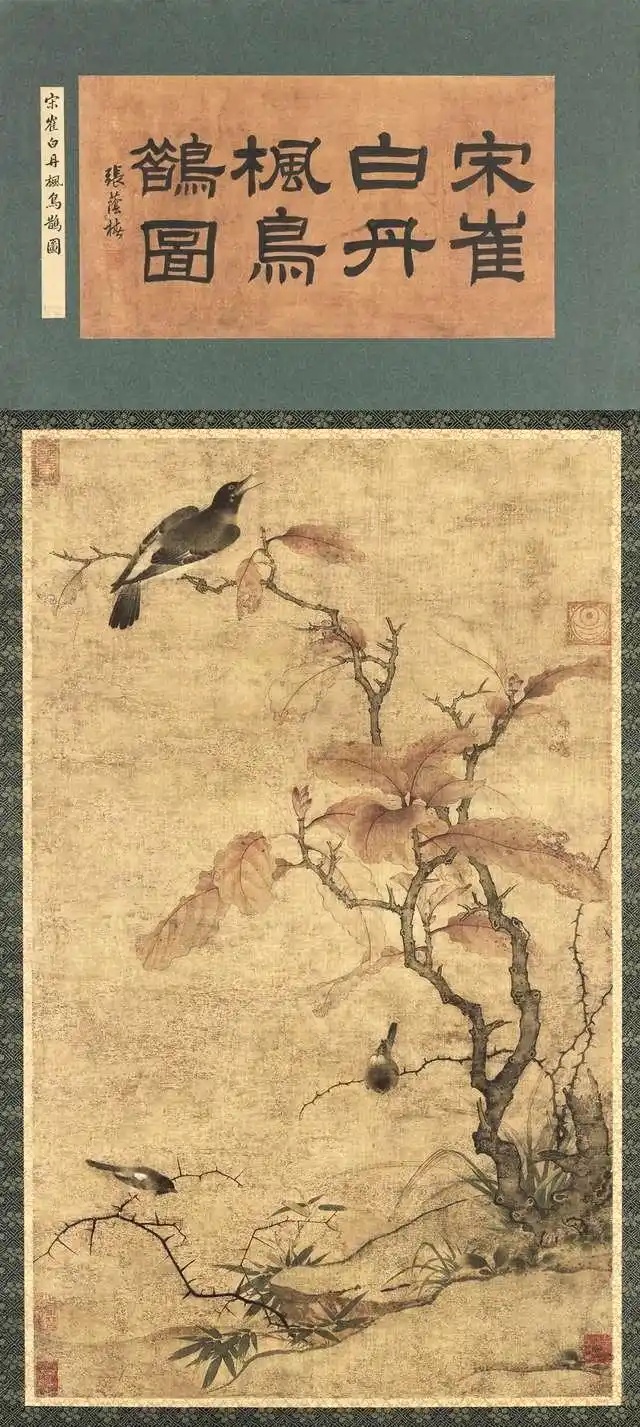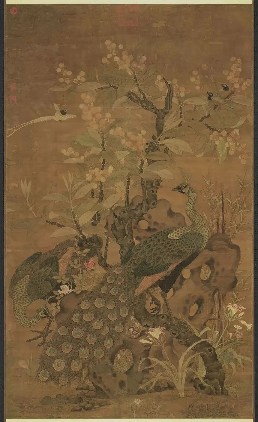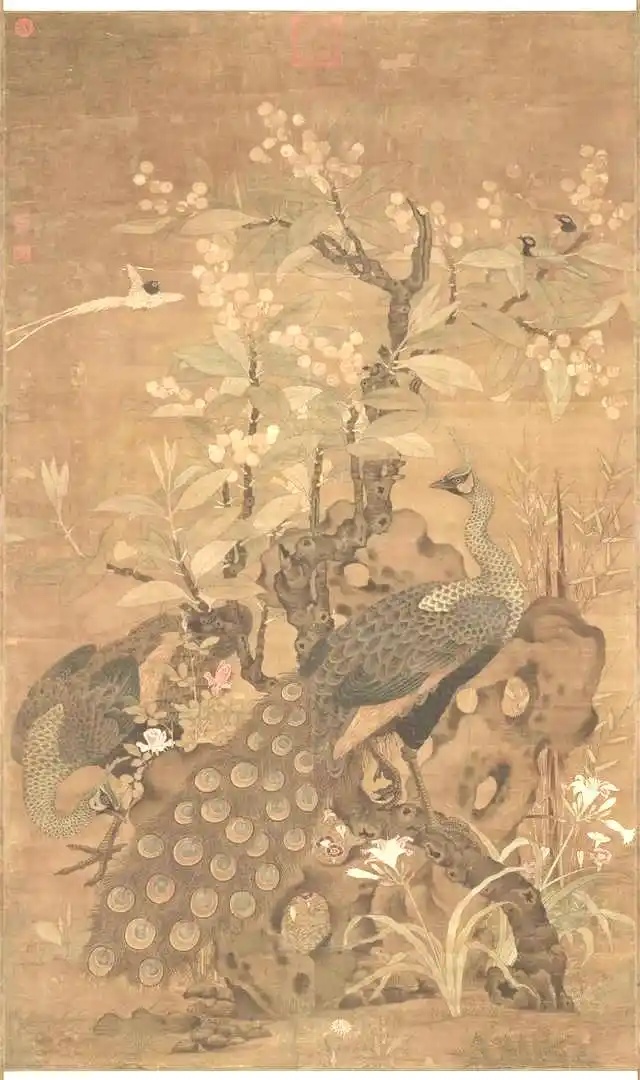 《枇杷孔雀图》画双孔雀踌枇杷下,上有三小雀陪衬,太湖石旁盛开著各色花卉,画面异常热闹,富有装饰性,与崔白〈双喜图〉的清淡疏秀互异。