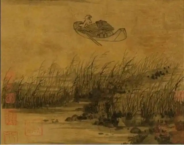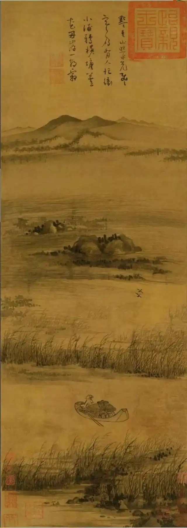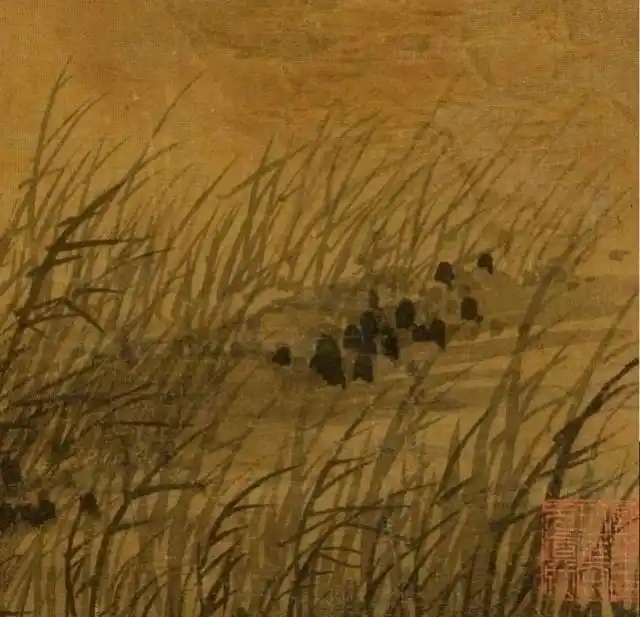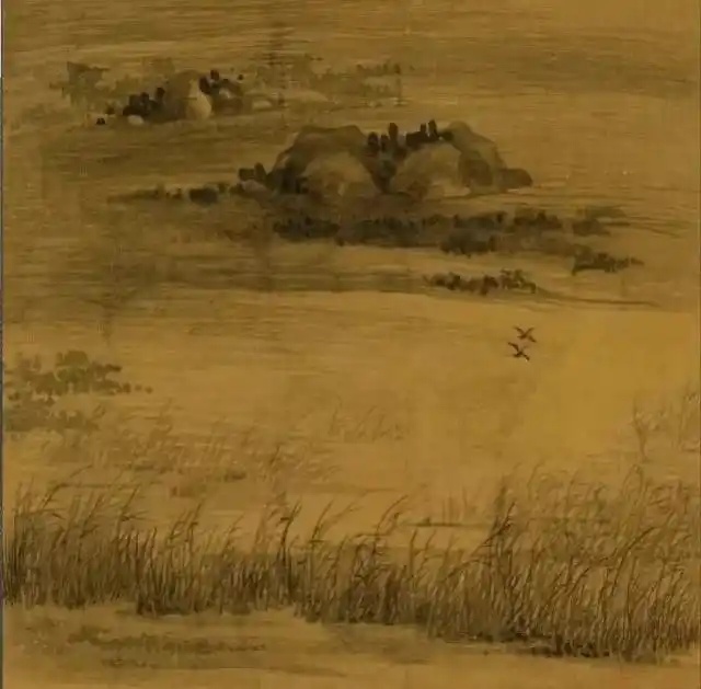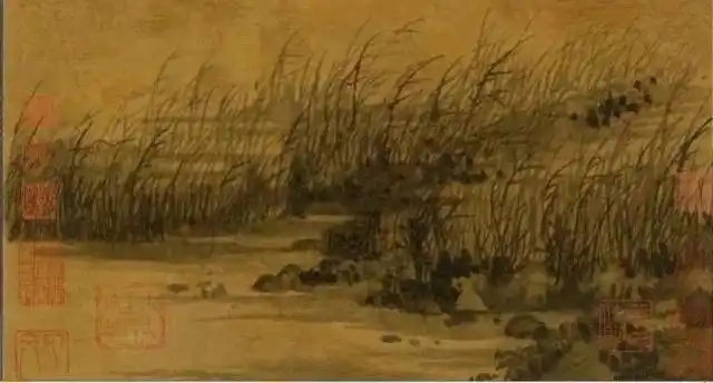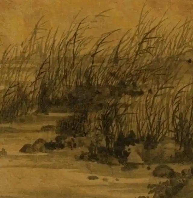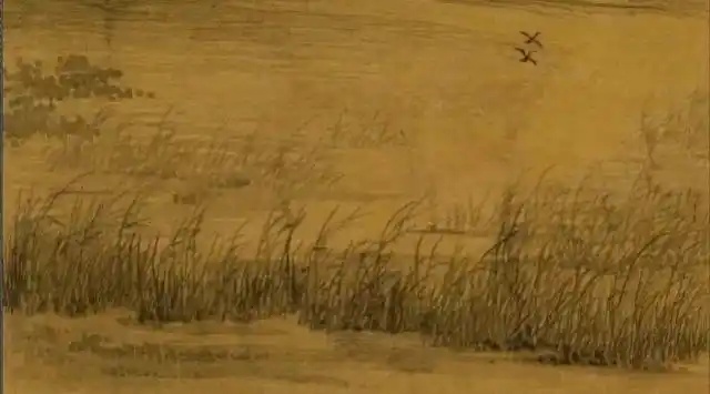 《芦花寒雁图》以平远法绘秋日水滨景色,水面微波荡漾,蒹葭苍苍,一双芦雁振翅飞起,渔父于舟头仰首凝视。画面空灵寒寂,形成了平淡清远的境界。图中以平行置景的手法表现空阔无际的水泊,以浓淡变化的水墨表现远近层次,平中见奇。远岫平溪、石滩丛树。溪中芦苇丛生,扁舟一叶。一人坐舟中抬头眺望,两只寒雁翱翔水面。芦苇渔舟用细笔勾描,远树滩头随意点染,笔法灵活,水墨湿润,意境幽深。