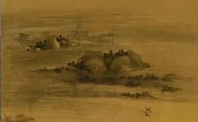画法与《渔父图》差不多,依然是用柔润的线条勾写,再加以披麻皴,罩一层淡水墨。淡水墨略分浓淡,以区分山石的凹凸向背。吴镇最为其明显特征是运用愈远愈高的构图手法。