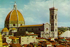佛罗伦萨主教堂的穹顶是欧洲文艺复兴时期意大利美术在建筑方面的第一个杰出成就。这个教堂原是十三世纪末佛罗伦萨手工业行会从贵族手中夺取政权后,为纪念共和政体的而建,但教堂的屋顶由于跨度太大,技术难度高,迟迟未能完成。直到十五世纪初,才由出身行会工匠、在机械、铸工、透视学、数学等方面都有重要建树的杰出的雕刻家和建筑师布鲁涅列斯基成功建成。在此之前,古罗马和拜占廷的建筑虽然也使用大型穹顶,但在外观上是半露半掩的。而布鲁涅列斯基设计的这一穹顶,则把它特别加以强调,在穹顶的底座特地砌了高12米的一段鼓座,使穹顶显得非常突出,连顶上的采光亭在内,教堂顶部高达107米,穹顶的直径为45米,比罗马万神庙的园顶还大,堪称史无前例,是文艺复兴时期创新精神的突出体现。所以,佛罗伦萨主教堂的穹顶一直被公认为文艺复兴时代的第一朵报春花。