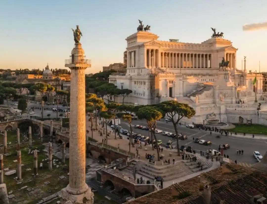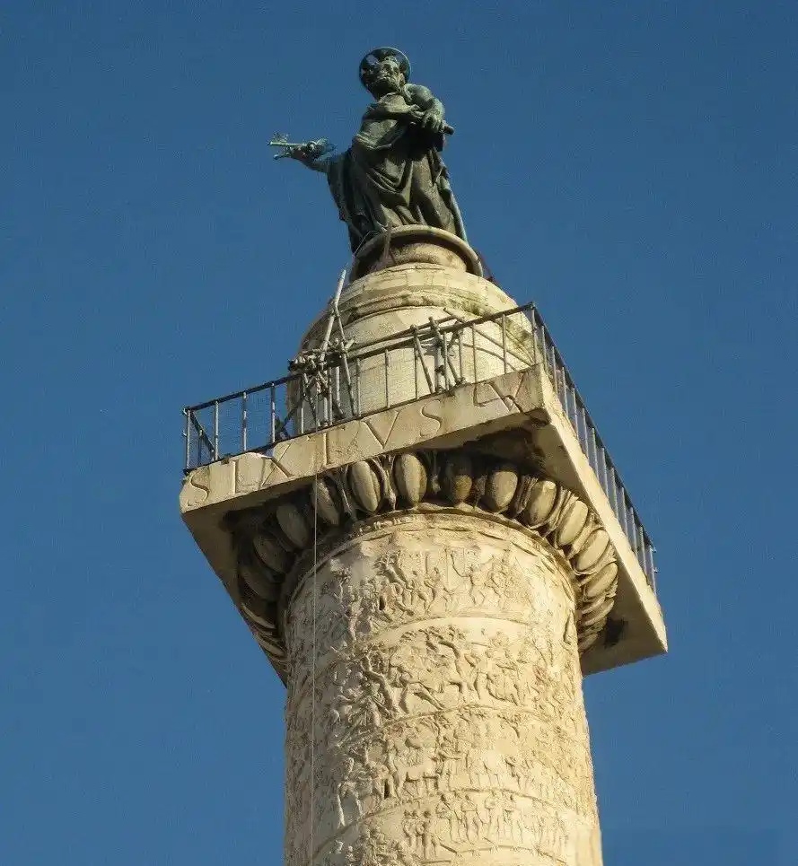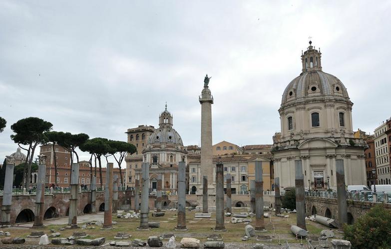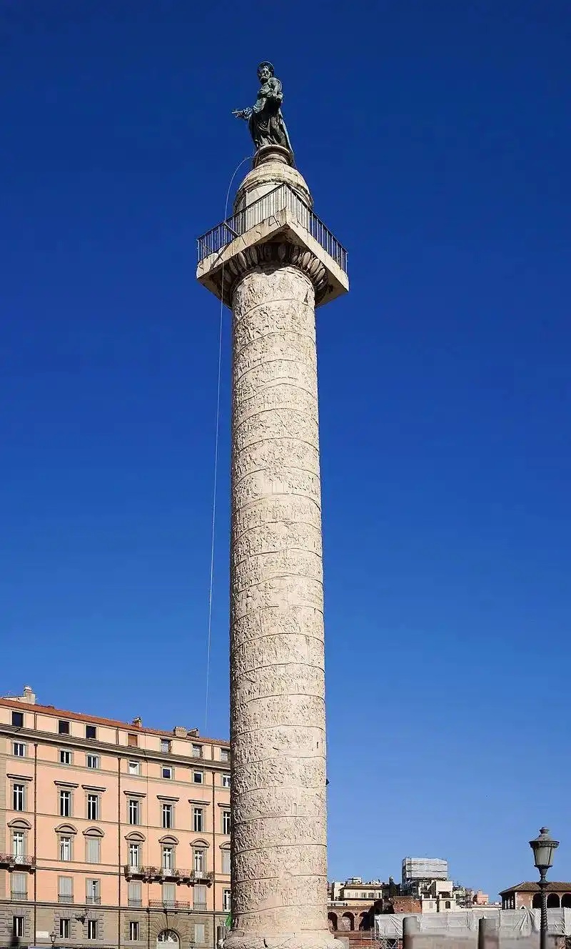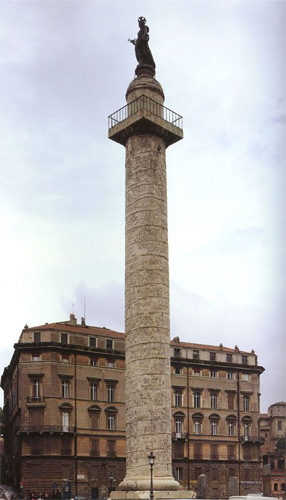 这是罗马市内图拉真广场上的纪念纪柱,纪念柱是古罗马人纪念建筑中的重要形式。这尊位于图拉真广场上的图拉真纪念柱是为了纪念公元2世纪初罗马帝国元首图拉真率兵侵入达契亚(在今罗马尼亚)而建,其高27米的纪念柱外表为大理石浮雕饰带覆盖。但因年代久远(约1800年),纪念柱上有些图像已出现严重风化情况。