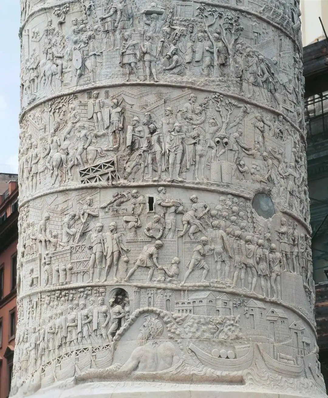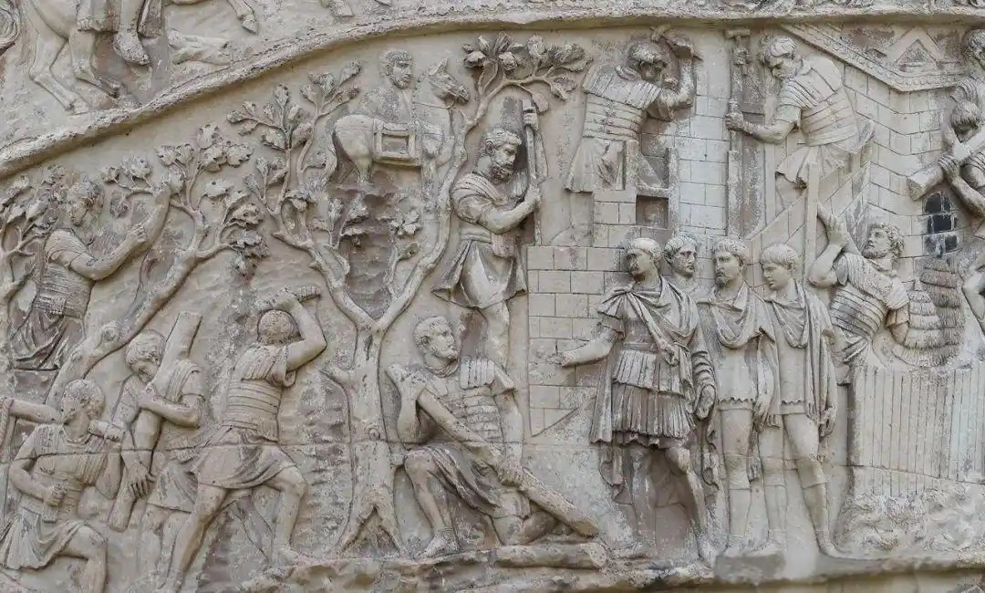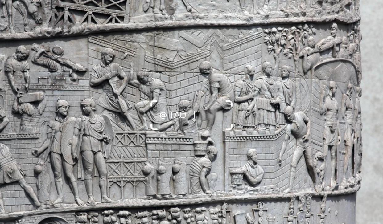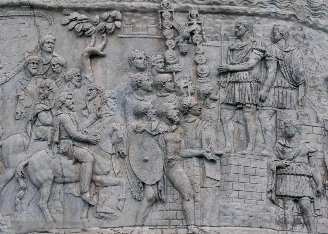 图拉真纪念柱上的这些浮雕饰带以23圈螺旋般环绕柱身。这些连续性浮雕,按编年史方式历述图拉真的战史,总共刻画了 2500多人物,以此仪后人不忘古罗马军队所取得的战绩。