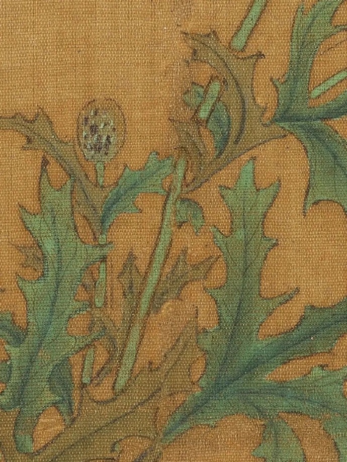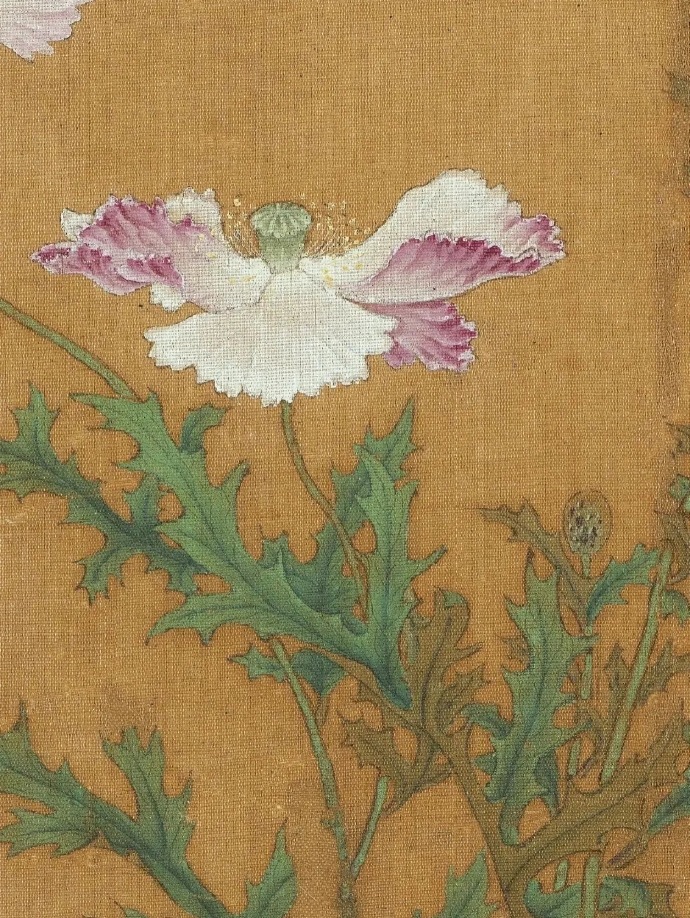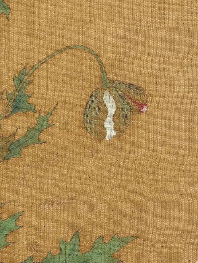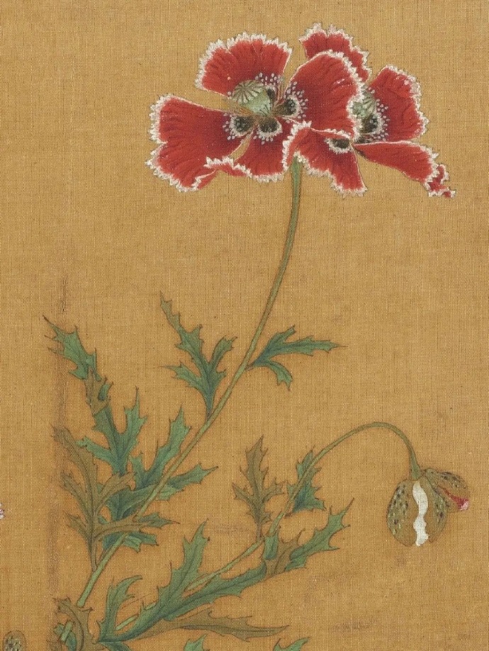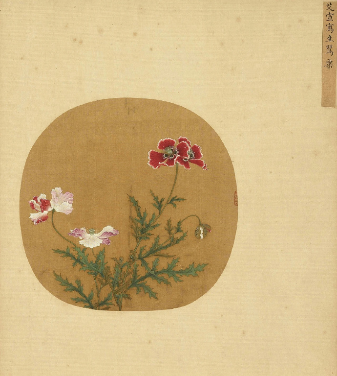 艾宣,金陵(今南京)人。擅花竹翎毛,传世画迹极少。罂粟花色鲜豔,花期夏季。此图细笔勾枝叶,花用粉和色染,沉厚浓豔兼有。