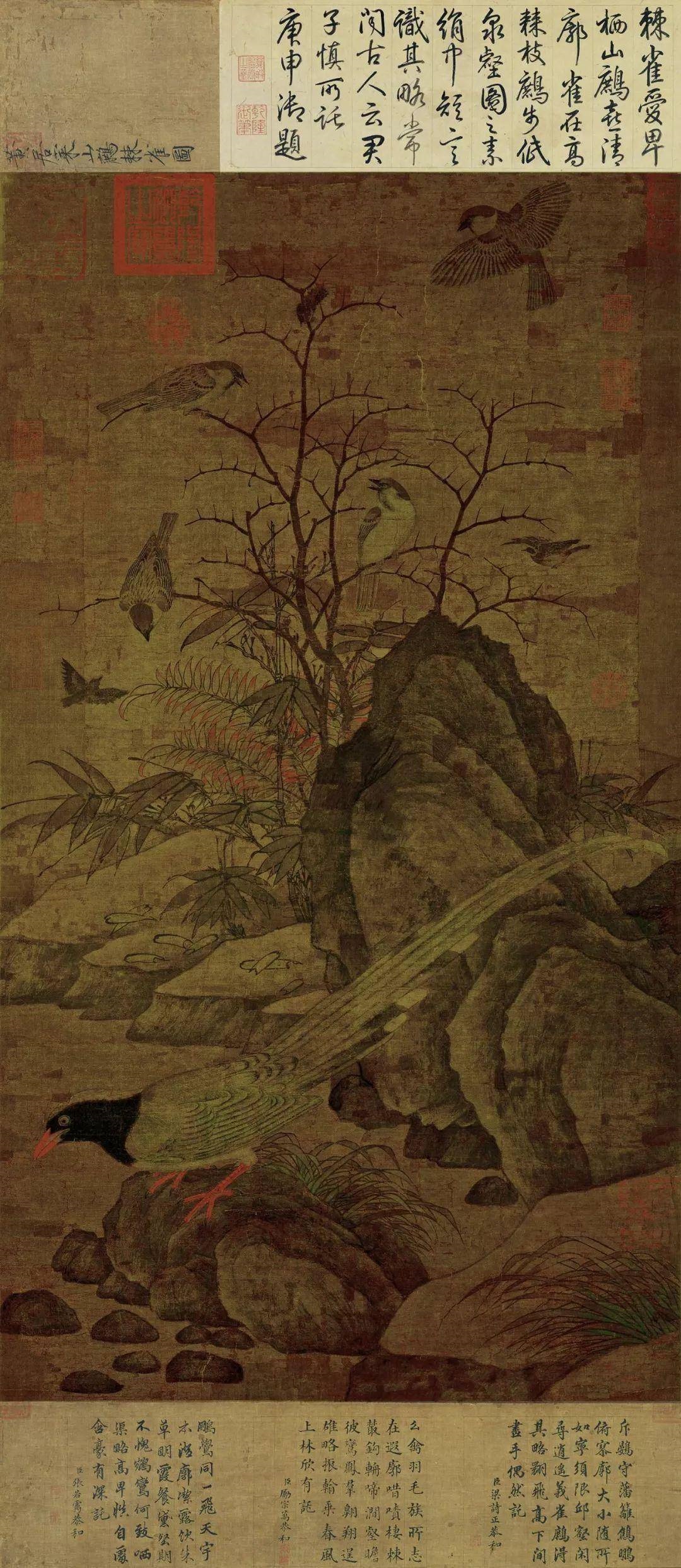 此幅中景物有动有静,配合得宜。像山鹧跳到石上,伸颈欲饮溪水的神态,就十分生动。另麻雀或飞、或鸣、或俯视下方,是动的一面;而细竹、凤尾蕨和近景两丛野草,有的朝左,有的朝右,表现出无风时意态舒展的姿态,则都予人从容不迫和宁静的感觉。下方的大石上,山鹧的身体从喙尖到尾端,几乎横贯整个画幅。背景则以巨石土坡,搭配麻雀、荆棘、蕨竹,布满了整个画面。画的重心在于画幅的中间位置,形成近于北宋山水画中轴线的构图方式。而具有图案意味的佈局,有著装饰的效果,显示作者有意呈现唐代花鸟画古拙而华美的遗意。
