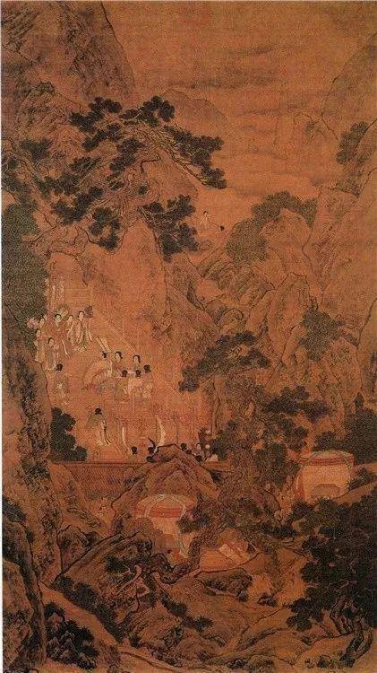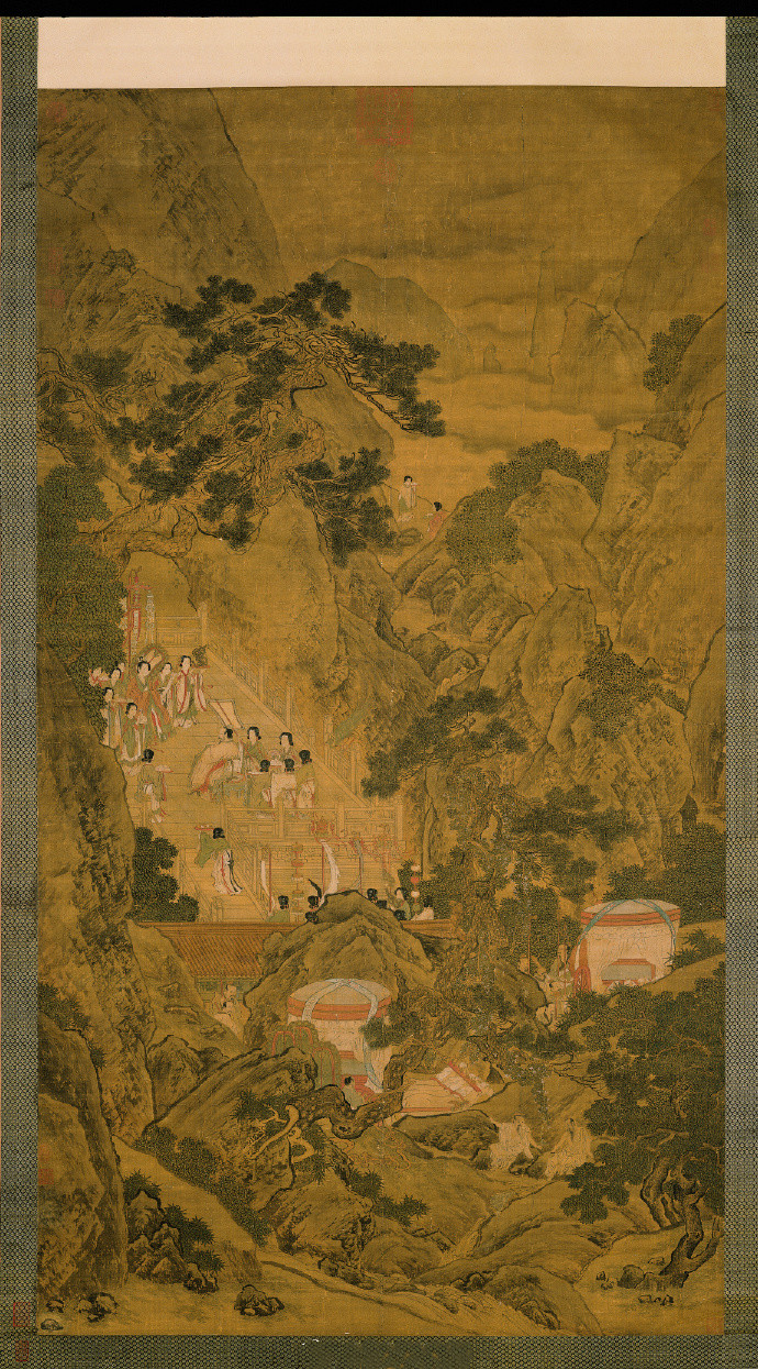 刘松年 《瑶池献寿图》据汉武帝内传载。西王母曾往见汉武帝。并赠仙桃四枚。本幅绘远处云峰匝绕。前景清泉激岩。山径上霓旌云幛。车马随从掩映于树石间。丘崖后微露殿脊。苍松悬壁。西王母与汉武帝相向对坐交谈。众女仙捧桃实竞进。有祥瑞庆寿之寓意。其人物描绘精谨。松树造型夭矫多姿。山石为已定型之斧劈皴。设色明艳。画上无款印。虽题为宋刘松年作品。或乃承明代周臣。唐寅。仇英风格之后人所作。