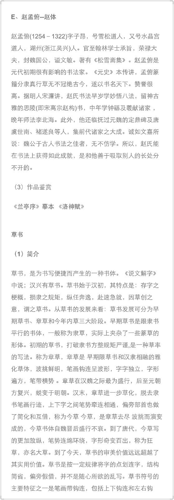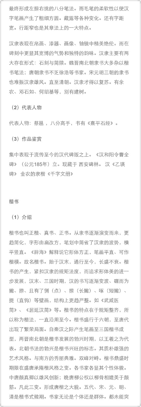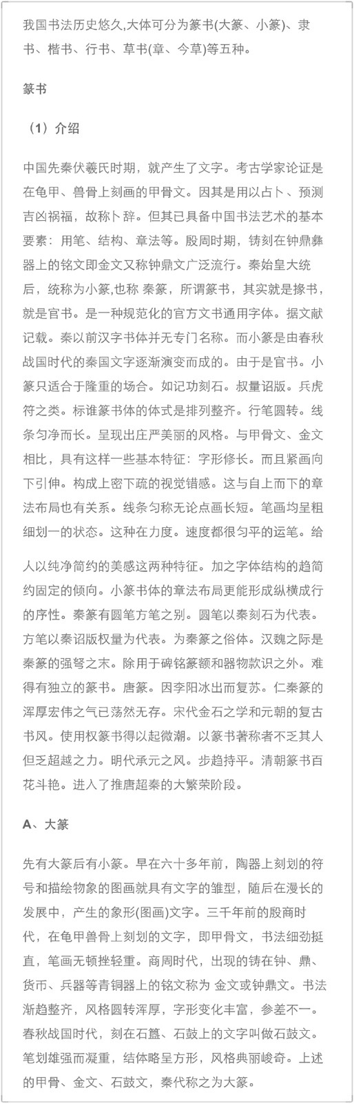 中国书法各种字体介绍 我国书法历史悠久,大体可分为篆书(大篆、小篆)、隶书、楷书、行书、草书(章、今草)等五种