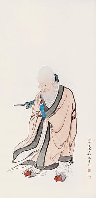 南极仙翁是神话传说人物中长寿的代表人物。这类绘画题材历史久远,渊源有自,以描绘南极仙翁洋溢的喜庆之气,形成了具有独立审美意义的主题范畴。此作陈少梅先生应庆杰先生之属为范有先生五十寿而写,具有特殊意义,描绘南极仙翁美髯长须,面带微笑,神情惬意;身着六朝士大夫的宽袍大氅,又显文人气息;在陈少梅笔下,赋予他一种独特的特质,体现出南极仙翁心无凡尘之恼。画面线条清劲流畅,颇有古意,粗与细、浓与淡、轻与重皆恰到好处,充分体现出作者传统功力的深厚,不仅写出了大氅轻薄的质感,对于仙翁面部的刻画尤为精彩,夸张的高额头、惬意的眼神和长耳皆以富有趣味的笔法写出。微风中,仙翁的头巾和衣袖宛若迎风飘曳之状,使整个画面显得格外生动。