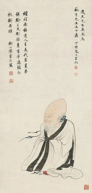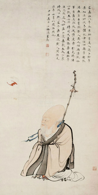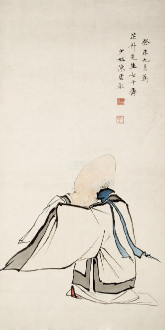 题识:宋嘉祐八年冬,京师有道人游卜于市,莫知其所从来。体貌古怪不与常类,饮酒无算未尝醉,都人异之相与传说,好事者图其状后近侍达帝引见赐酒,一石饮至七升时,司天台奏寿星临帝坐,忽失道人所在,仁宗嘉叹久之。仁宗时天下熙熙,宜乎寿星游戏人间,躬见于帝必有以感而然也。甲申嘉平,少梅陈雲彰。