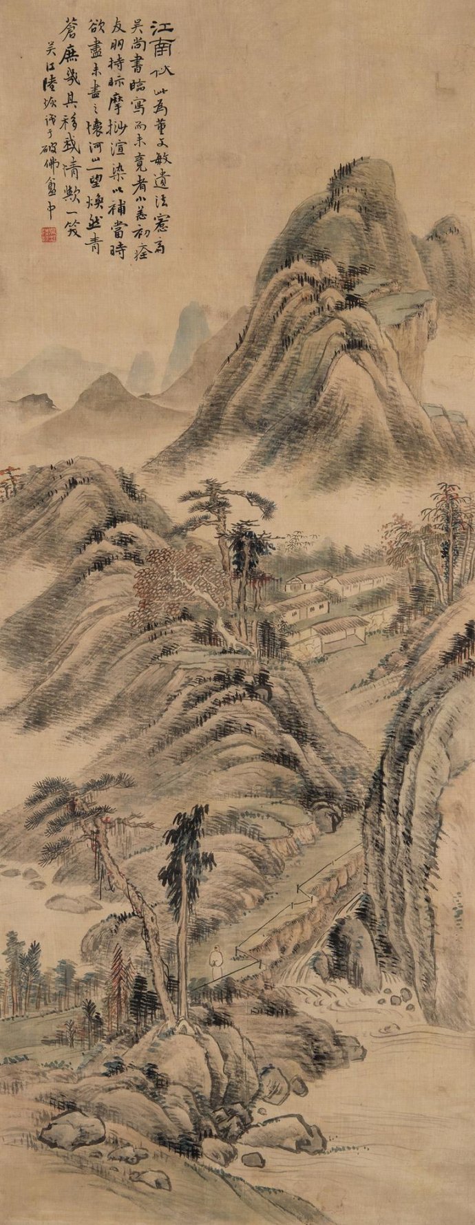 题识:江南秋。此为董文敏遗法,愙斋吴尚书临写而未竟者。小恙初痊,友朋持示,摩挲渲染以补当时欲尽未画之怀。河山一望,焕然青苍,庶几具移我情欺一笑。吴江陆恢,识于破佛庵中。钤印:吴江陆恢(白文)