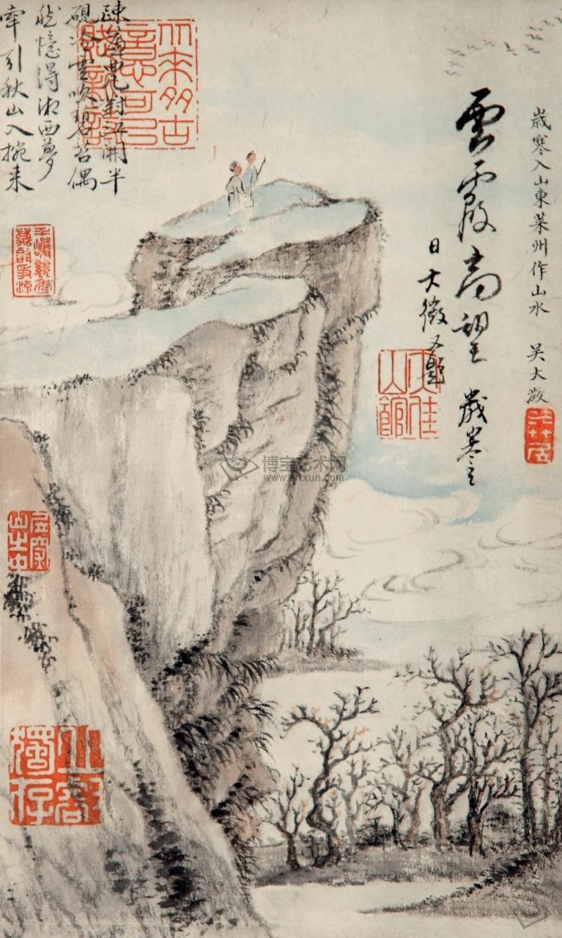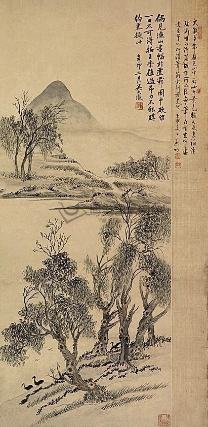 款识:偶见渔山画幅于虚雾园中,欲留一日不可得。物主索值过昂,力不能购,约略拟此。辛卯二月,吴大徵。钤印:愙斋(朱文)
