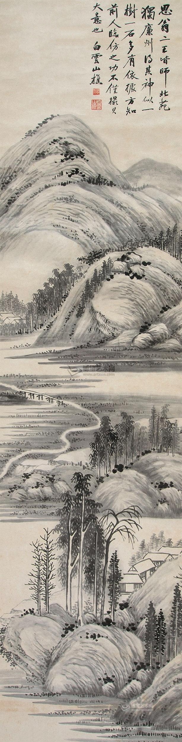 款识:思翁、二王皆师北苑,独廉州乃其神似,一树一石多有依据,方知前人临仿之功,不仅撮其大意也。白云山樵。钤印:愙斋(白文)、白云山樵(白文)