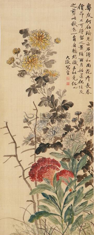 款识:粤友何伯瑜视石涛和尚花卉长卷,价昂不可得,留之案头匝月始还。偶忆及之,剪此秋色一角。自惭形秽,未能免俗也。大徵写生。钤印:吴大徵印(白文)、愙斋(白文)