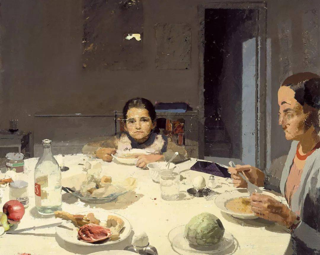 画风细腻,描绘性强,画面有着虚实相生的效果,是洛佩斯画作的又一特点。他的画风属于典型的写实主义,画面并非精密的刻画,虚与实没有绝然的分别,虚中有实,实处有虚:对画面看似无意的“破坏性”,往往以似未完成之感呈现,给予观者异常的感受。《晚餐》(The Dinner,1971-1980年)中,餐桌静物与人物的处理十分特别。画中的餐桌静物整体笼罩在暖黄的光线下,盘碟杯瓶和食物显得柔和而暧昧,局部有类似丝网版画才有的印痕感与颤动的效果,造型严格但不刻意寻求精确,有一块肉甚至是用照片拼贴上去的,真实的质感与餐具的朦胧形成十分强烈的对比。此画第一时间映入观者眼帘的是,餐桌对面女儿沉静的神情和专注的目光。为了减弱画面右边母亲的脸在画面的分量,洛佩斯不惜将她的五官画错位,以“未完成式”使画面产生镜头晃动、时光游移感。这幅画中,在其以往画作中那种样式化的构图、立体主义式的造型、堆砌的笔触、诡异的画面氛围等常见因素已经全部消失。充满画面的那种沉稳含蓄的家庭气氛,斑驳感十足的制作效果。作为洛佩斯艺术语言的典型特点,显示出了他对材质的高度驾驭能力,及其对家庭亲情的温存眷顾。
