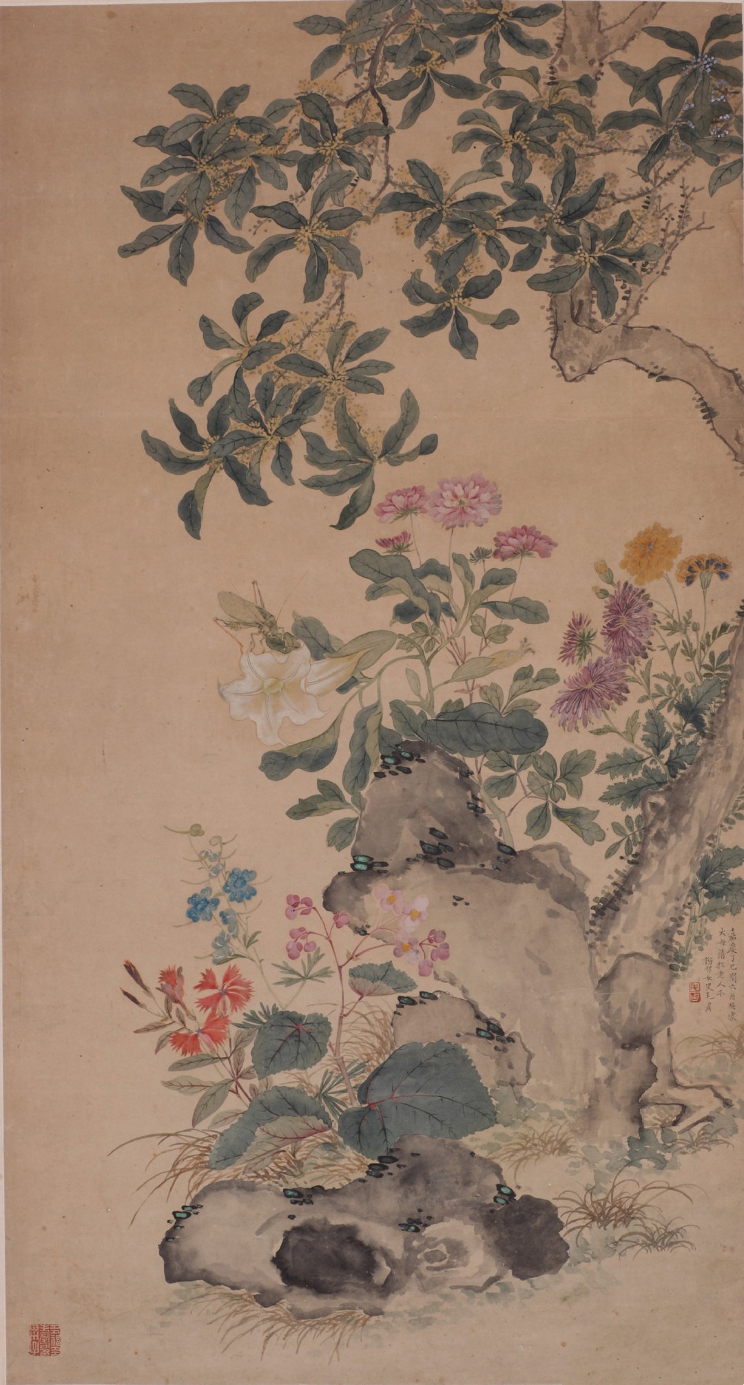 毛周,字榴村,江苏武进人,生卒年不详,活动于清乾嘉年间。她是恽冰孙女,自幼从恽冰学习恽氏没骨画法,颇得画学之理,彭蕴灿《耕砚田斋笔记》言她“点缀花卉,极其精丽”。根据其自题,这件《秋卉图》便是她临摹祖母恽冰之作。图中绘坡石两块,略作皴染,石旁点缀丛兰,石后有海棠、菖蒲、石竹、芍药、菊花、曼陀罗等花卉,多用没骨法写就,设色妍丽,姿态静逸。石上之点苔和花上之小虫又为画面增添不少生趣。图中桂树描绘尤其生动,树叶翻仰俯卷,极富变化,丹桂点缀其间,展卷一观仿佛有清香扑鼻而来。