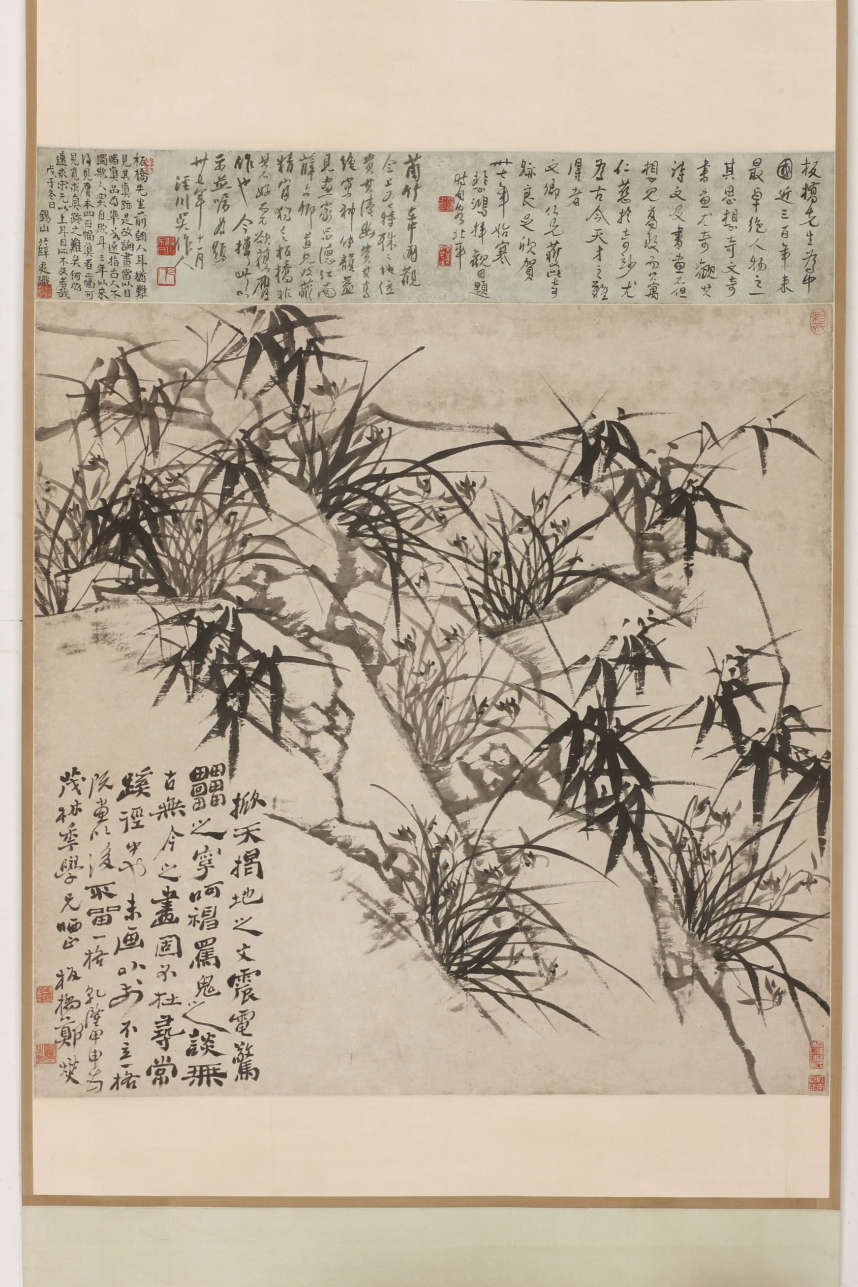 郑燮(1693-1765),字克柔,号板桥。江苏兴化人。由进士出任山东范县和潍县知县,罢官后在扬州以卖画为生,其是“扬州八怪”中最为人所称道的画家,擅绘兰竹石,尤精墨竹。本作体现了郑氏的典型画风,用墨干淡并施,笔法瘦劲挺拔,布局疏密相间,清瘦雅逸,意趣不凡。