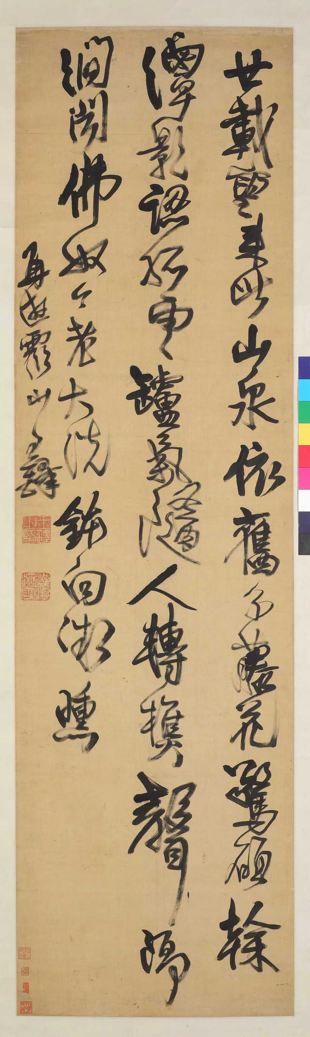 王铎(1592-1652),字觉斯,一字觉之,号十樵,又号痴仙道人。河南孟津人。明亡降清后王铎政治上无所求,将全部精力都用于书法,艺术已臻化境,对后世影响深远。王铎书诸体悉备,楷书师法钟、颜,而以行草为最,其行草书不以势重,信笔挥洒。该作草书笔势连绵流畅,行气贯通,十分精彩,颇具苍郁雄畅之风。