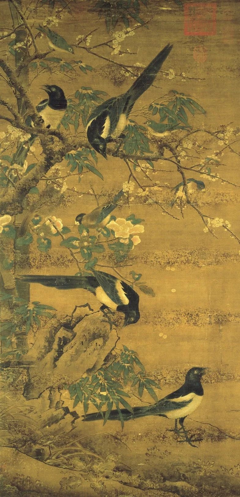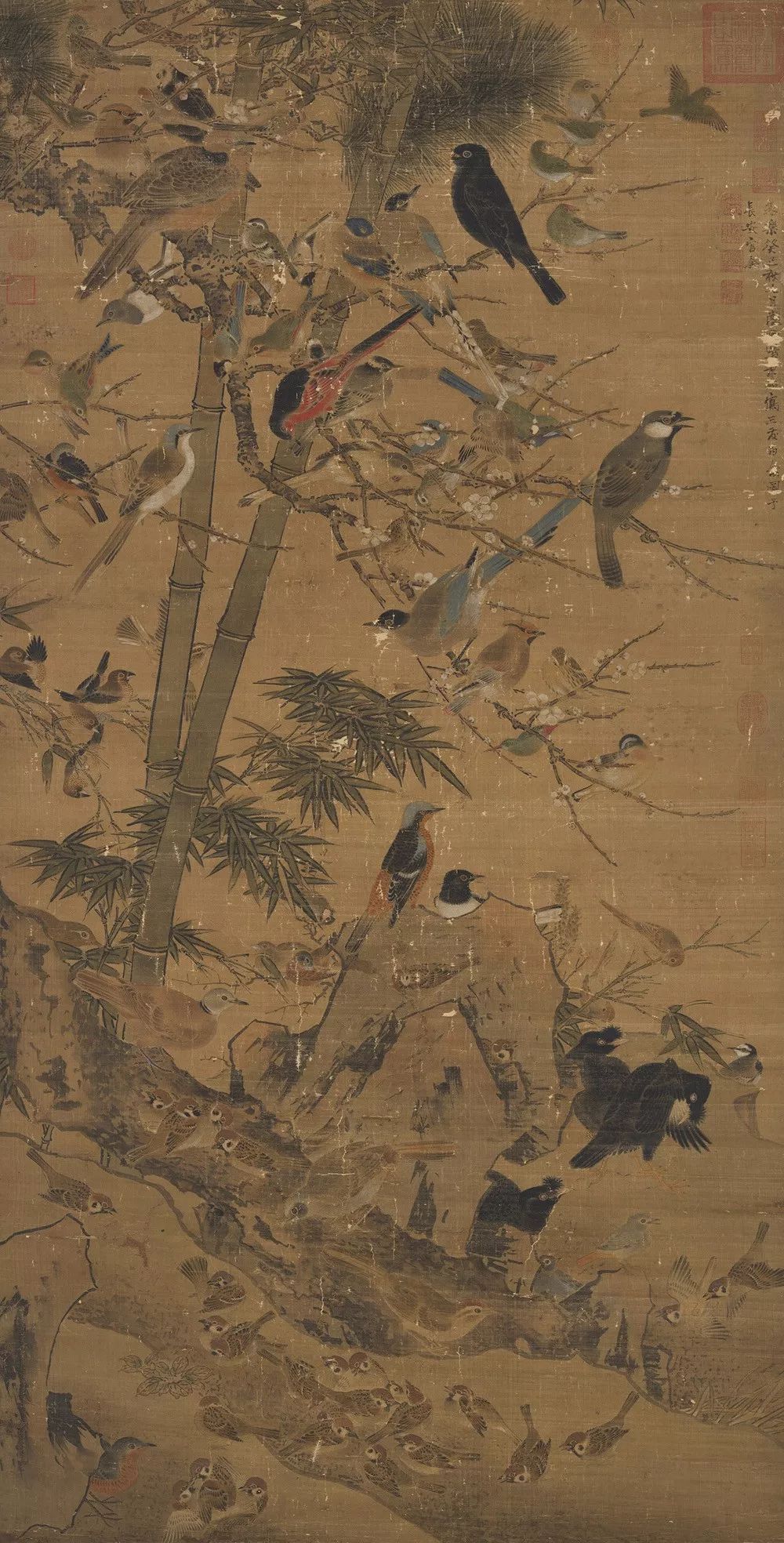 全幅设色对比鲜明,整体画风工整典雅,刻画精细自然。明显继承了五代黄筌以及宋代画院花鸟画的富贵品貌,带有浓郁的宫廷气息。