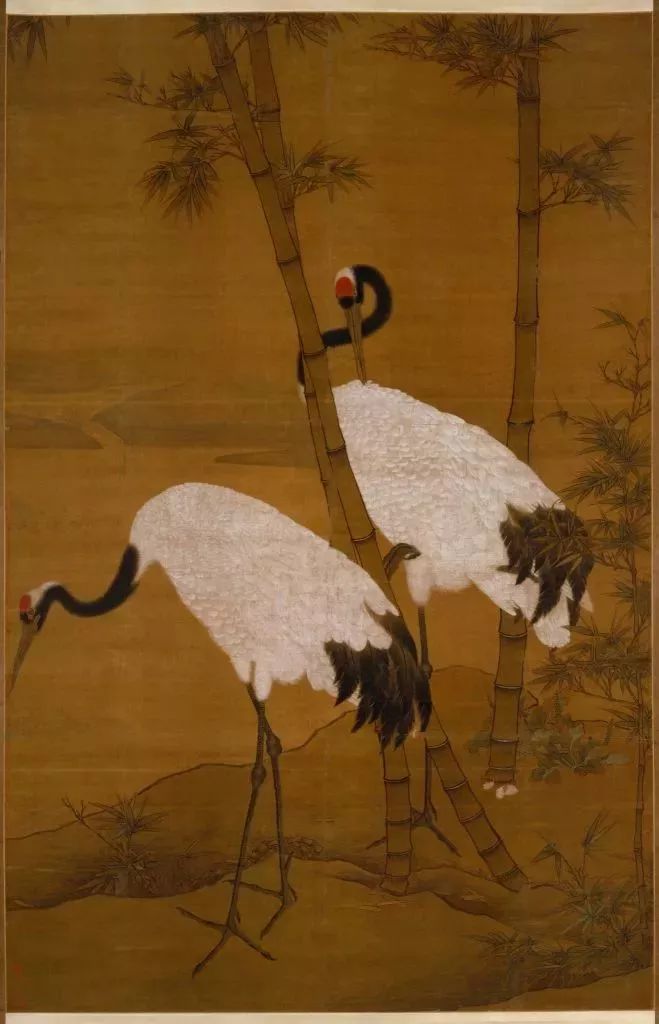 《竹鹤图》,画中一对仙鹤姿态优雅,轩昂高洁。因尺幅巨大,画中双鹤更是几乎和真鹤等身大小。两只仙鹤或低头觅食,或啄羽休憩,在翠竹间怡然自得。