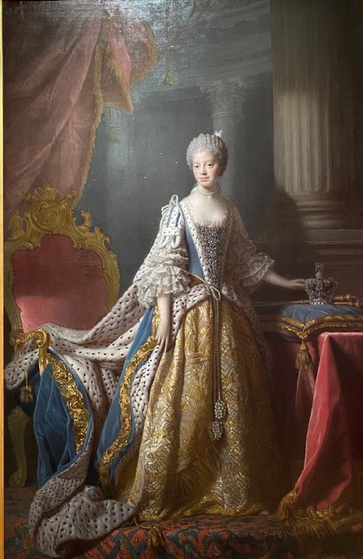 Allan Ramsay (艾伦·拉姆齐)(1713-84),《夏洛特皇后》,约1762年。夏洛特皇后身着加冕礼服。衬裙是用银布做的,上面绣满了金线,而肚子——观众们经常评论——是由细小的钻石网构成的,上面覆盖着较大石头的叶状图案。它被估价为6万英镑,相当于今天的980多万英镑。随着时间的推移,乔治三世和夏洛特皇后画像中的彩绘长袍,原本是紫色的,由于红色釉料在光照下分解,已经变得更蓝了。