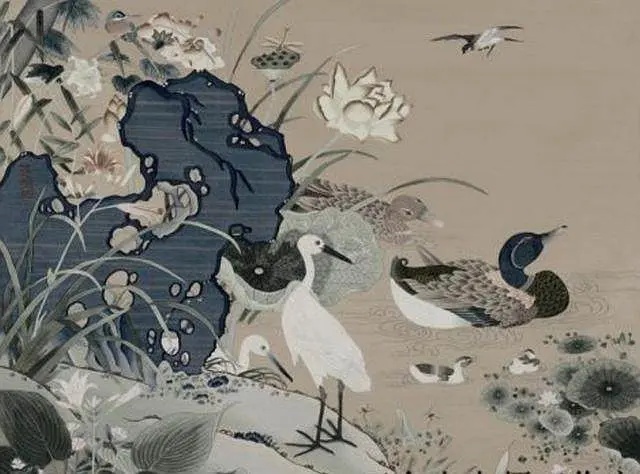 缂丝艺术品,朱克柔传世之作。成莲花盛开的池塘中,以游戏争食的母鸭为中心,岸边的白鹭和翠鸟与之相映成趣,蜻蜓飞舞,草虫唧唧,把游禽、飞鸟、草虫、花卉等自然生态和奇山怪石、潺潺流水等自然景色,浑然结合在一起,可谓是巧夺天工,精湛绝伦。此缂丝画幅极大,色彩丰富,丝缕细密适宜,层次分明,是朱克柔缂丝画中的杰作。朱克柔是南宋高宗时代缂丝工艺大师。