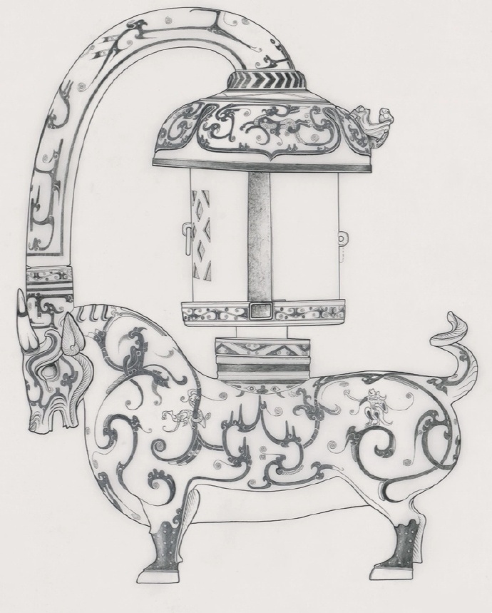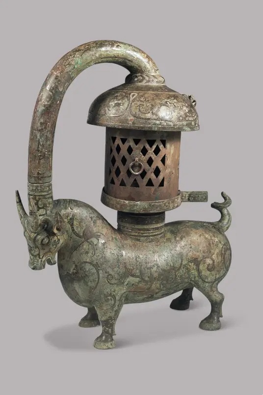 1980年出土于江苏扬州市邗江区甘泉2号东汉墓(墓主人为东汉初年广陵王刘荆),通高46.2厘米,身长36.4厘米,全器作牛驮灯盏造型,其结构分为灯座、灯盏、烟道三部分,灯座的牛俯首站立,体形肥硕,看似静态,但螺旋翘尾、睁眼张嘴、竖立的耳朵和对角、略微移动的腿。灯盏安在牛背正中的圆形座基上,灯盏有两片可转动的菱格镂孔灯罩,可双透光。灯罩镶入圆形灯盘边缘的凹槽中,灯盘有短把,点燃蜡烛后可以转动灯罩以调节光照的角度。全灯设计绝妙,在牛首上连一弯管与灯体相接,是烟道又是灯把手,一举两得。牛体与灯体也相连,牛腹中空,可存水溶烟。可见,此灯还具有节能环保功能。圆形带柄灯盘上有可转动的屏板,并通体以错金银工艺装饰流云纹等纹饰。