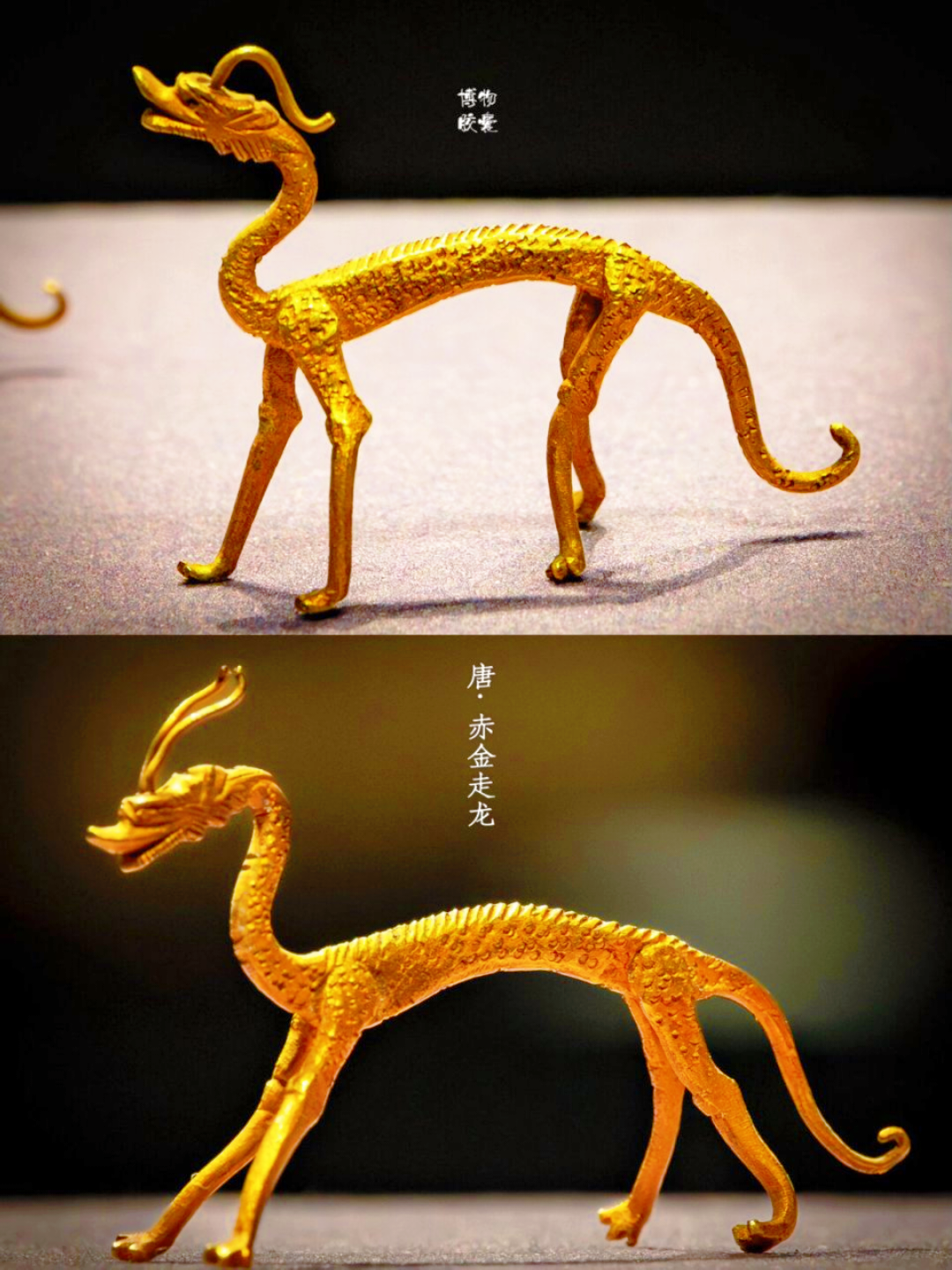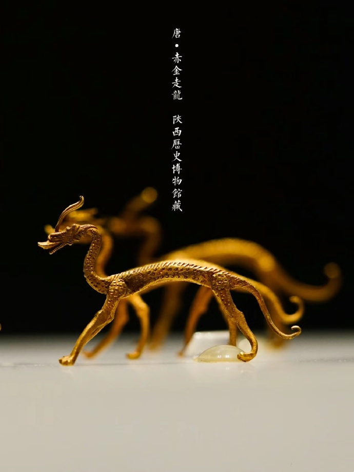 唐赤金走龙为一组小金龙,最高的2.8厘米,最矮的2厘米,身材纤细,阔嘴伸颈,头顶双角,折曲于脑后,圆眼深目,两唇张开,颌腮部位饰长鬃纹样颈弯二曲,身上鼓,尾下拖,末端上卷,除脊背和尾脊有长鬃纹样外,满身皆饰深凹的网点纹,为饰片状鳞纹,通体雕满片片翘动的鳞片,大小均在毫米之间似用钎尖插点而成,阔嘴,长尾卷舒, 作各种姿态的行走状。