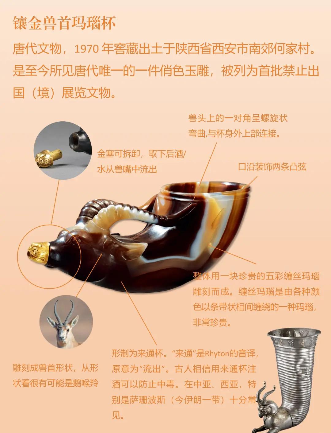 镶金兽首玛瑙杯:唐代玉器巅峰,整块玛瑙雕琢,兽首镶金,奢华工艺融于一体。