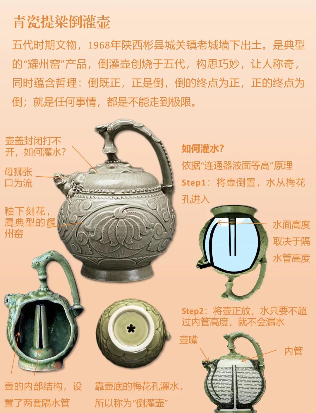 青瓷提梁倒灌壶:设计精妙绝伦,底部注水不漏,耀州窑工艺典范。
