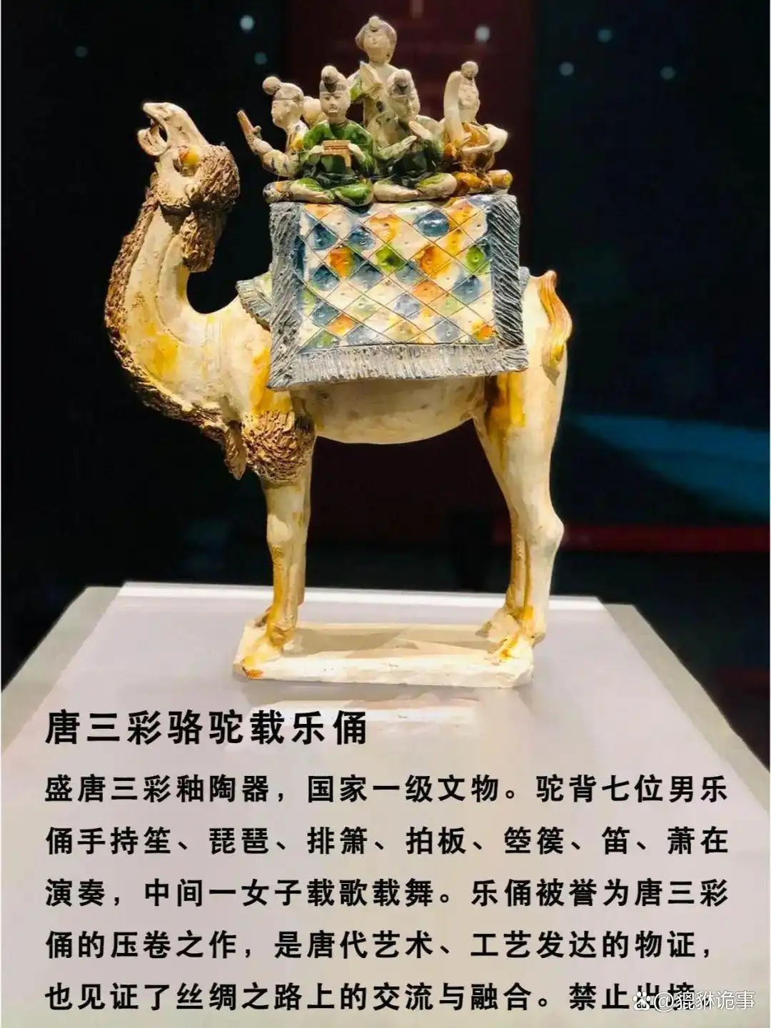 唐三彩载乐骆驼俑:罕见艺术珍品,乐俑齐聚驼背,展大唐多元文化交融盛景。