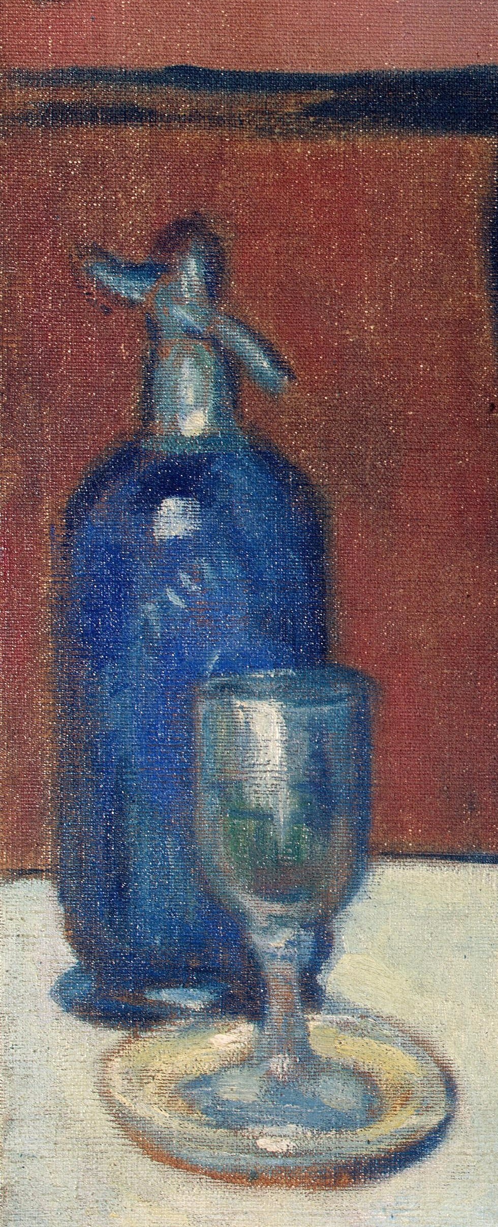 毕加索将这位孤独的女人“摆放”在咖啡馆的桌子上,脏红色调的背景墙,透着她无家可归的失落感。刻意强调的平整的画布,墙壁的颜色和大理石桌子的蓝色调,压缩了女人周围的视觉空间,更显得无望与寂寞。
