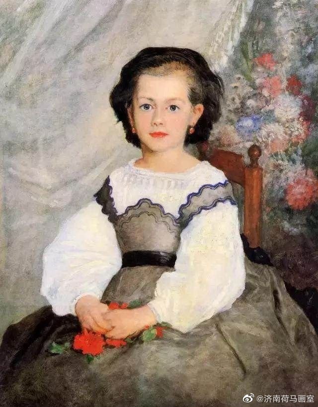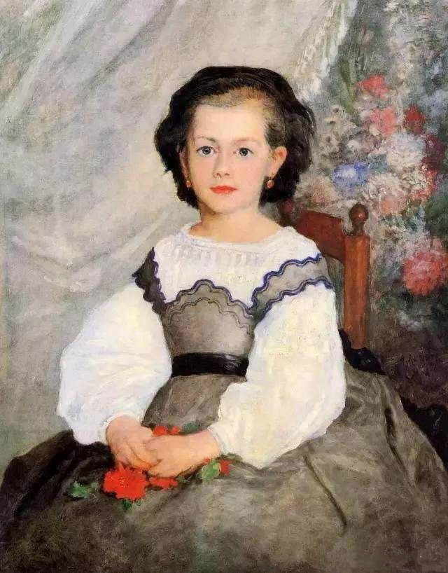 这是雷诺阿保存下来的作品中最早的一幅油画。画面上是一个穿着华丽的、摆着一副郑重其事的照相式姿势的可爱的女孩子,背景是儿童卧室气氛的蓝粉色。绘画的手法是写实的,但也是小心谨慎的,似乎生怕破坏了美的法则。尽管对这幅肖像存在着各种不同的看法,它不能被归属为某一个画派风格的作品;说得确切些,就其技巧看,这是一幅符合当代时髦风格的学院派油画。然而,这还是一幅诱人的作品,因为这里已能感觉到一股为雷诺阿所特有的那种诗意。