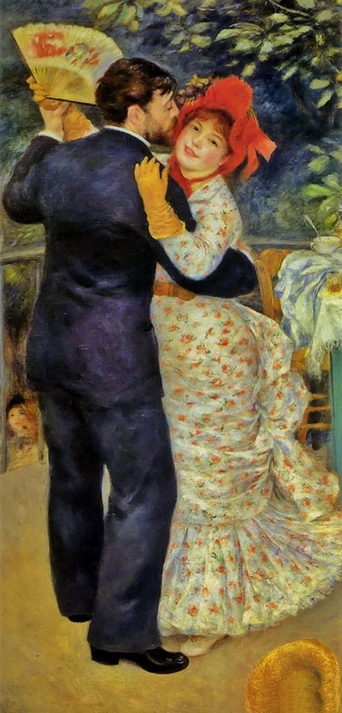 雷诺阿的《城市之舞》和《乡村之舞》两幅画是成对设计的。《城市之舞》是在优雅的舞厅,而《乡村之舞》是在乡村的树下。《城市之舞》温文尔雅,服饰凉爽;《乡村之舞》热情奔放,尽管餐桌狼藉,帽子丢弃于地,女主角的笑容,给人以温暖。这两幅作品中,画家试图用更精确更细楚的笔触,以脱离他早期的印象主义风格。《乡村之舞》中这位圆脸带笑妙曼起舞的女郎,便是雷诺阿的妻子亚琳。亚琳那种天真单纯的快乐,是雷诺阿最喜爱的女性特质。