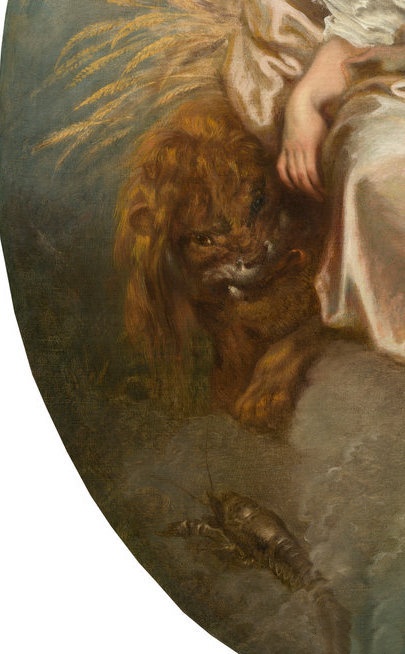 谷神星的服装上闪耀着光芒,浅粉色调的衬托下,她的严肃姿势也显得柔和。这可能是由著名画家Charles de La Fosse介绍给Crozat的,Watteau或许是根据这位老艺术家的素描创作了Ceres的形象。