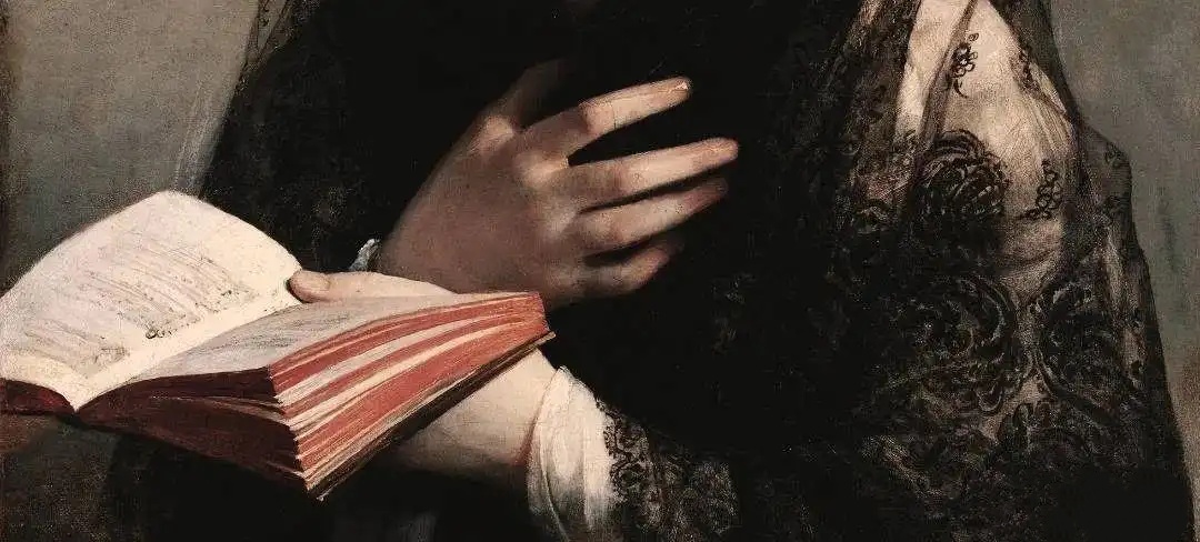 这幅画描绘了一位手执一本书的女子,她的眼神飘向远方,仿佛沉浸在自己的白日梦中。画中的女子有着琥珀色的瞳孔,闪烁着星光,仿佛在诉说着她的迷梦。