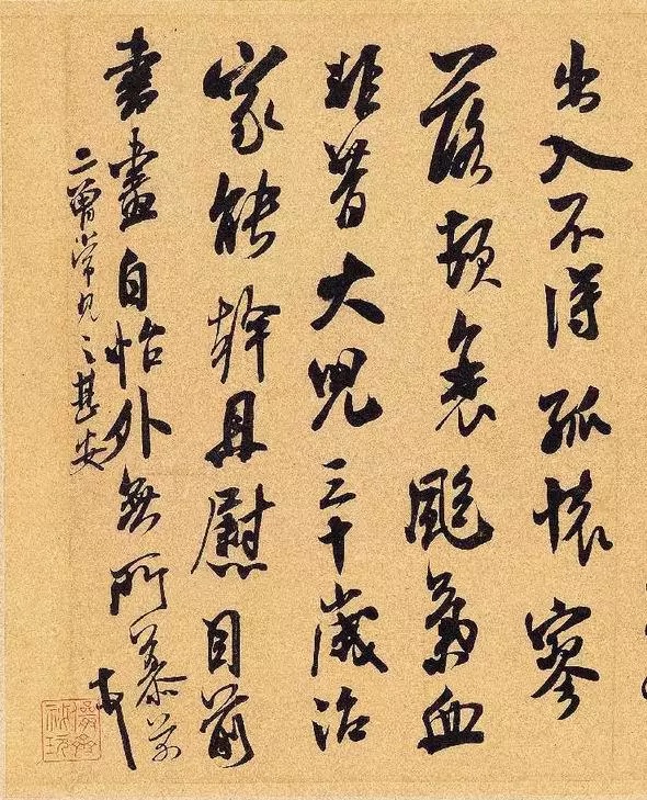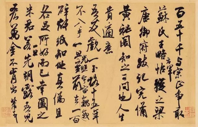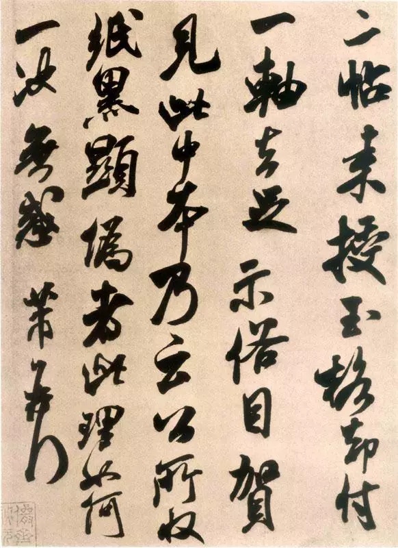 翰牍九帖之二 纸本 行草书 纵25.4厘米 横43.2厘米 台北故宫博物院藏。 【释文】:(前补书:丞果实,亦力辞,非愿非愿) 芾顿首启:画不可知(旁注:不知好久),书 则十月丁君过泗,语与赵 伯充,云要与人,即是此物。纸紫赤黄色,所注真字,褊 草字,上有为人模墨 透印损痕。末有二字: "来戏",*才字也。告留。念其 直就本局虞候拨供给 办。或能白 吾老友吾舍人,差两介送 至此,尤幸尤幸!再此。芾顿首上, 伯修老兄司长。…… 不记得也。存纸尾。 《晋纸帖》 翰牍九帖之三,纸本,行草书, 纵23.7厘米,横39.1厘米。 台北故宫博物院藏。 【释文】:此晋纸式也,可为之。越竹千杵裁出,陶竹乃腹不可杵,只如此者乃佳耳。老来失第三儿,遂独出入不得,孤怀寥落,顿衰飒,气血非昔。大儿三十岁,治家能干,且慰目前。书画自怡外,无所慕。芾顿首。二曾常见之,甚安。 《适意帖》 又称《玉格帖》 翰牍九帖之四,纸本,行草书, 纵23.5厘米,横35.9厘米。 台北故宫博物院藏。 【释文】:百五十千,与宗正争取苏氏《王略帖》(旁注:右军),获之。梁、唐御府跋记完备。黄秘阁知之,可问也。人生贵适意,吾友觑一玉格,十五年不入手,一旦光照宇宙,巍峨至前,去一百碎故纸,知他真伪,且各足所好而已,幸图之!米君若一旦先朝露,吾儿吝,万金不肯出。芾顿首。 《贺铸帖》 翰牍九帖之五,纸本,行草书, 纵23.4厘米,横36.8厘米。 台北故宫博物院藏。 【释文】:芾再启。贺铸能道行乐慰人意。玉笔格十袭收秘,何如两足其好。人生几何,各阏其欲。即有意,一介的可委者。同去人付子敬二帖来授,玉格却付一轴去,足示俗目。贺见此中本乃云公所收纸黑,显伪者。此理如何,一决无惑。芾再拜。 米芾《丹阳帖》 翰牍九帖之六,纸本,行草书, 纵23.5厘米,横22.8厘米。 台北故宫博物院藏。 此帖所致为米芾之友人。此友人乃《适意帖》中“觑一玉格,十五年不入手”之“吾友”。 【释文】:丹阳米甚贵,请一航载米百斛来,换玉笔架,如何早一报,恐他人先。芾顿首。 《丹阳帖》,《书法大辞典》称为《丹阳帖》;蔡舜宁《米芾之书学思想与书法艺术研究》称为《换玉笔架书》。“丹阳”乃润州古称。秋榖未登,青黄不接,米价必至踊贵,故此帖必作于崇宁二年夏秋之间。米芾愿以玉笔架换百斛丹阳米,寥寥二十余字,“如何”二字是商量的口气,有点调皮;“早一报,怨他人先”,则活脱可见其幽默诙谐。从文字看来,已有《世说新语》中晋人名士风度。此帖文字较少,虽是行书,但全帖完整,显得净洁可爱。 《致伯充尺牍》又称《业镜帖》 翰牍九帖之七(二帖),纸本行草书, 纵23.5厘米, 横21.6厘米, 台北故宫博物院藏。 【释文】:敬闻命。此石亦不恶。业镜在台州耳。芾顿首。伯充台坐。彦臣如何? 《伯充帖》 又称《致伯充尺牍》 翰牍九帖之七(二帖),纸本。 纵27.8厘米,横39.8厘米。信札一则。 台北故宫博物院藏。 【释文】:十一月廿五日。芾顿首启。辱教。天下第一者。恐失了眼目。但怵以相知。难却尔。区区思仰不尽言。同官行。奉数字。草草。芾顿首伯充台坐。 米芾《惠柑帖》