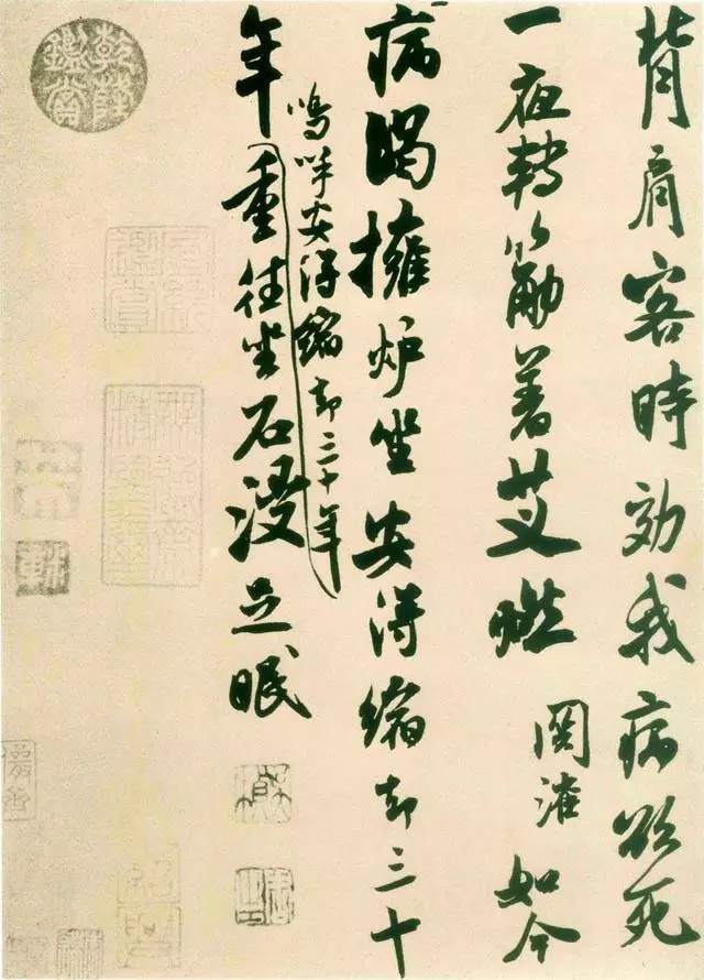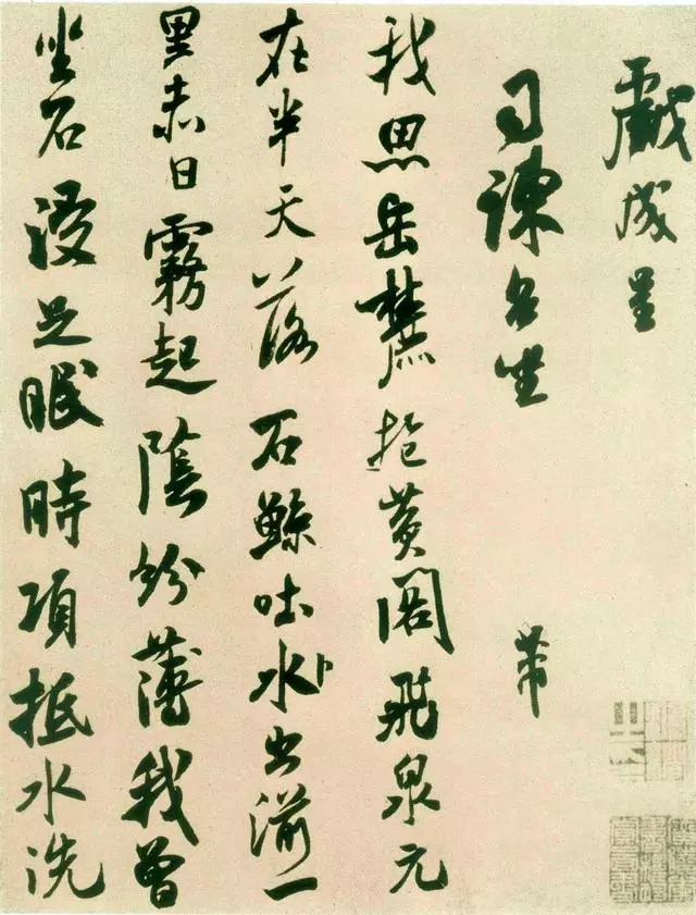 翰牍九帖之八,纸本,行草书, 纵22.7厘米,横33.2厘米。 台北故宫博物院藏。 【释文】:芾皇恐。蒙惠柑,珍感、珍感。长茂者适用水煮起,甜甚。幸便试之。余卜面谢,不具。芾顿首。司谏台坐。 《戏成诗帖》 翰牍九帖之九,纸本,行草书, 纵23.9厘米,横34.6厘米。 台北故宫博物院藏。 【释文】:戏成呈司谏台坐,芾。我思岳麓抱黄阁,飞泉元在半天落。石鲸吐水(点去)出湔—里,赤目雾起阴纷薄。我曾坐石浸足眠,时项抵水洗背肩。客时效我病欲死,—夜转筋着艾燃。关漼。如今病渴拥炉坐,安得缩却三十年。呜呼!安得缩却三十年,重往坐石浸足眠。