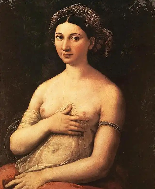 画中的美丽女子有双深色眼睛,半裸地以精致薄纱遮住下半身。据史料记载,拉斐尔享年37岁,他8岁丧母,11岁丧父,身为宫廷二级画师的父亲对他影响很深。他生前有个家世显赫的未婚妻,罗马教廷红衣主教的姪女-玛丽亚,这位差点成为拉斐尔妻子的女人,却不及面包师的女儿受宠,数百年来大家一直认定,拉斐尔其实与面包师的女儿- Margherita Luti玛格丽塔.卢蒂情投意合,且祕密举行婚礼,碍于社会舆论压力,拉斐尔一直严守这个秘密,最终将它带入坟墓。