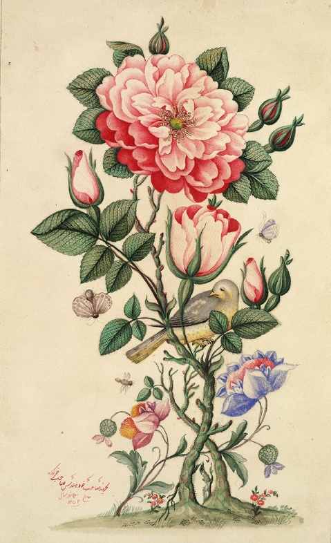 《玫瑰与夜莺》,纸上绘画,伊朗,1837年。