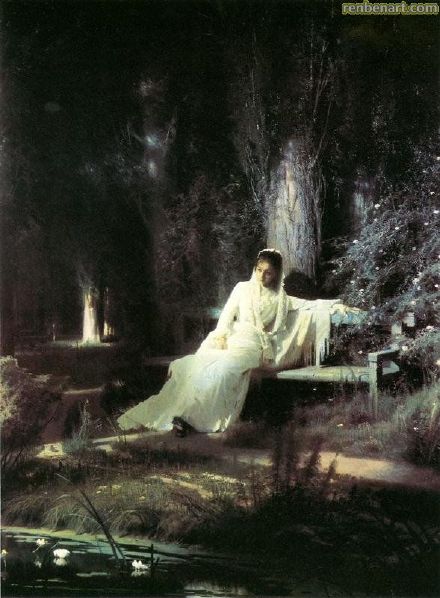 月夜】这是一幅被人誉为“爱情诗”的油画,它继承了俄罗斯艺术的民族性与文学性,叙述了一个美丽的故事。画家用银灰色的调子,来渲染恬静的夏夜,没有微风,参天的菩提树显得神秘幽邃,夜色中的蔷薇花散发出清香。这样的时刻,一个穿白色衣裙的美丽少女,独坐池塘边的长椅上,她面前的池塘中漂浮着睡莲和菖蒲。人物与环境处理得十分和谐,迷蒙的月光洒满林中,恍若仙境,令人向往,使人陶醉。俄国画家克拉姆斯柯依创作,现藏于特列恰柯夫美术馆。